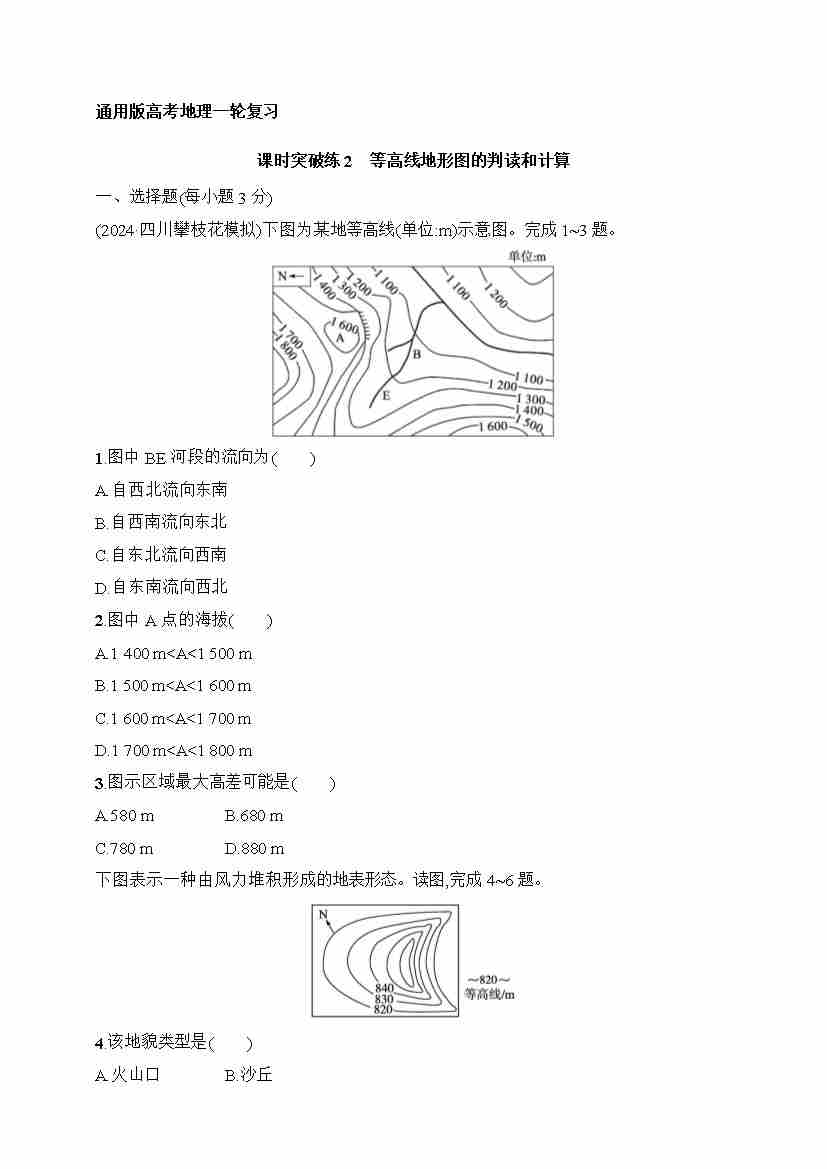 课时突破练2 等高线地形图的判读和计算(含答案)