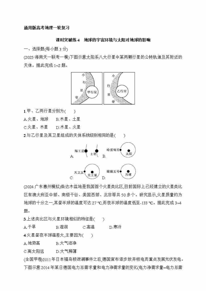 课时突破练4 地球的宇宙环境与太阳对地球的影响(含答案)
