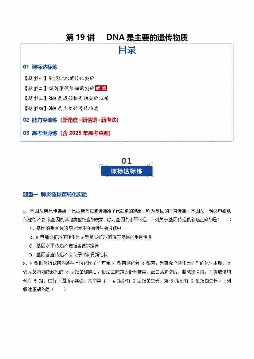 第19讲 DNA是主要的遗传物质(专项训练)(学生版)