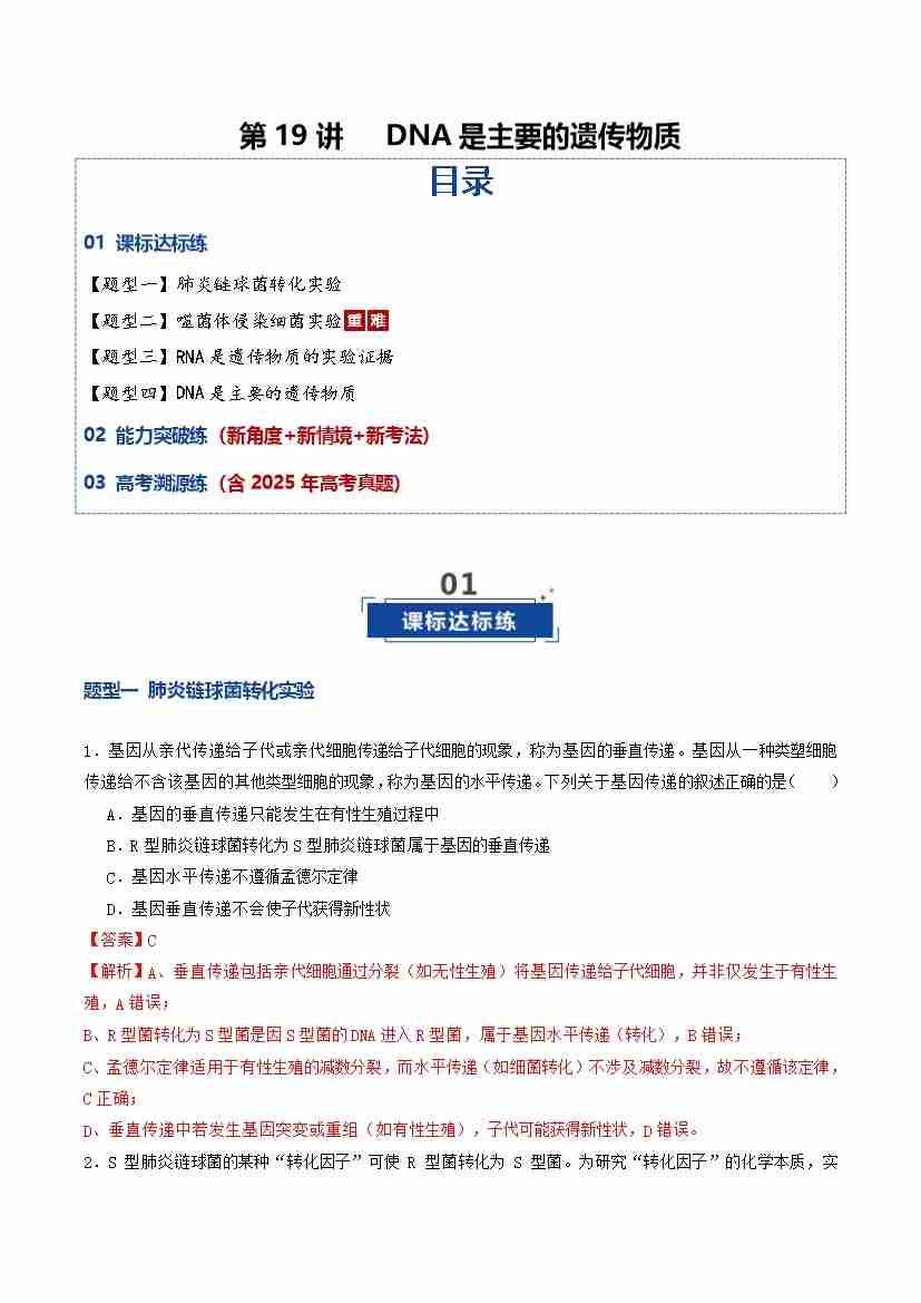 第19讲 DNA是主要的遗传物质(专项训练)(教师版)