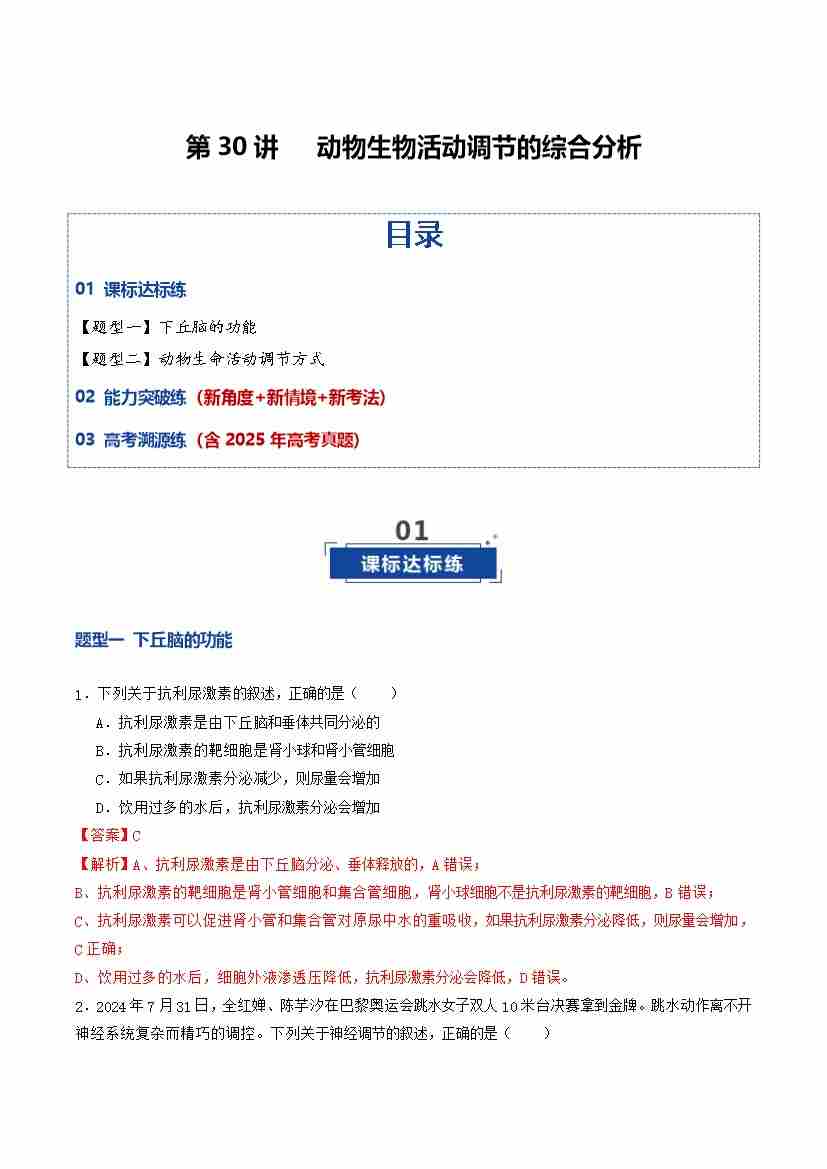 第30讲 动物生命活动调节的综合分析(专项训练)(教师版)