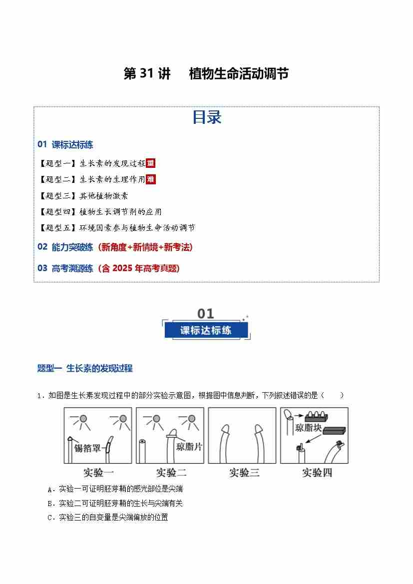 第31讲 植物生命活动调节(专项训练)(学生版)