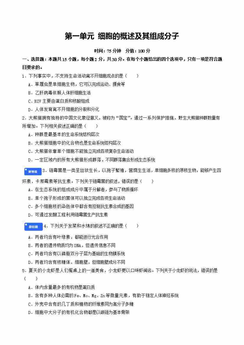 第一单元 细胞的概述及其组成分子(综合训练)(学生版)(全国通用)