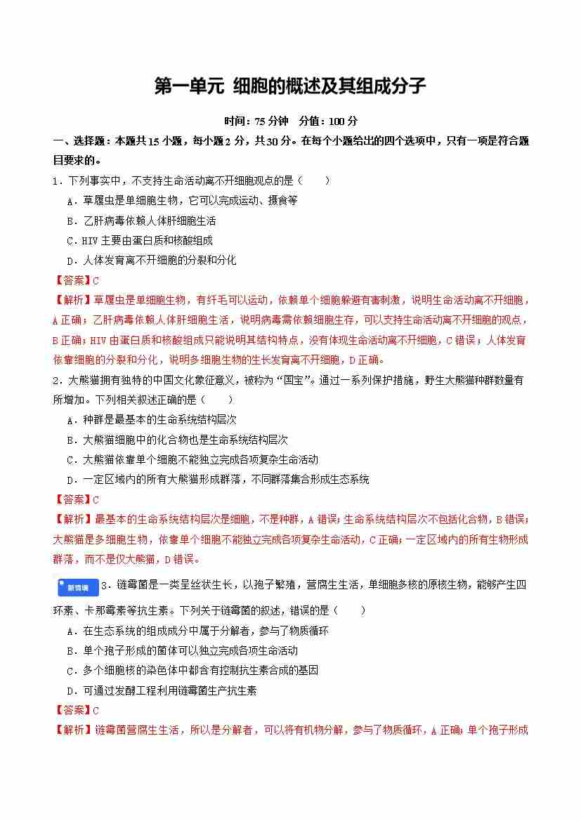 第一单元 细胞的概述及其组成分子(综合训练)(教师版)(全国通用)