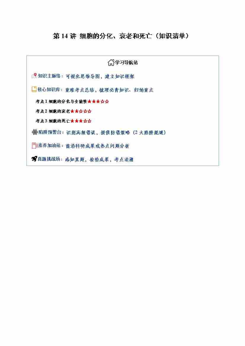 第14讲 细胞的分化、衰老和死亡(知识清单)(全国通用)(学生版)