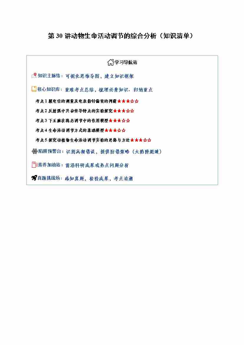 第30讲 动物生命活动调节的综合分析(知识清单)(全国通用)(学生版)