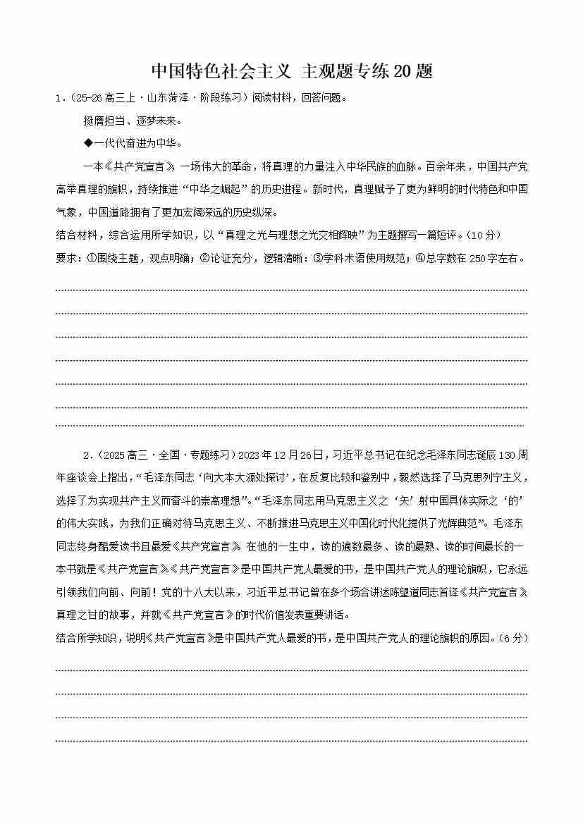 中国特色社会主义 主观题专练20题 (学生版)(全国通用)