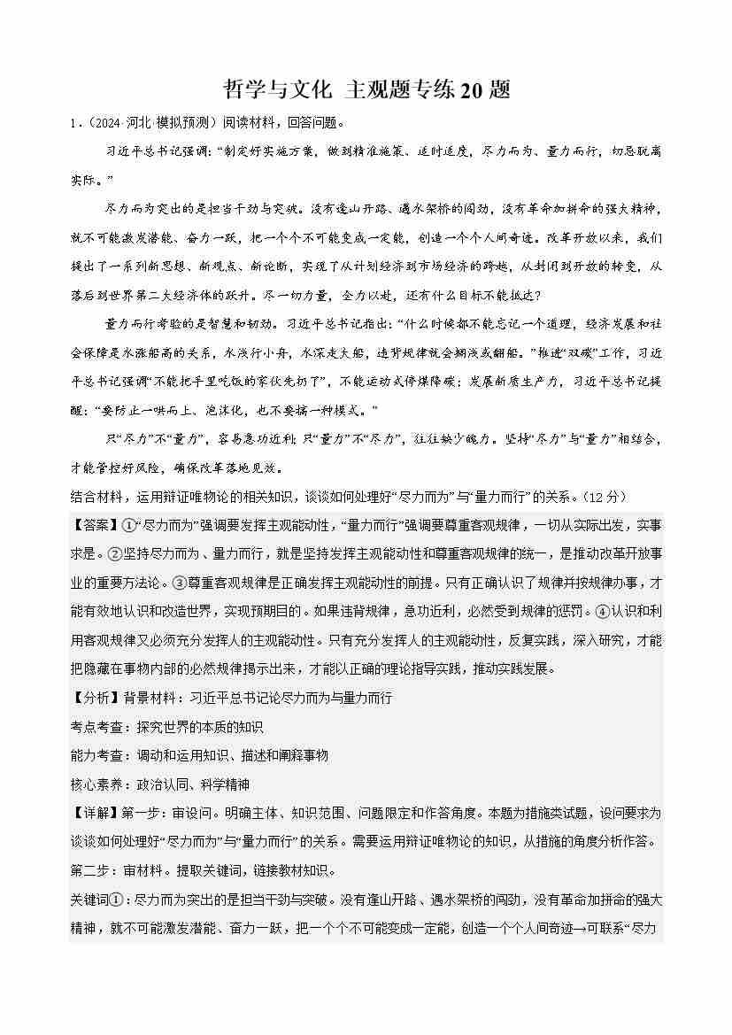 哲学与文化 主观题专练20题(教师版)(全国通用)
