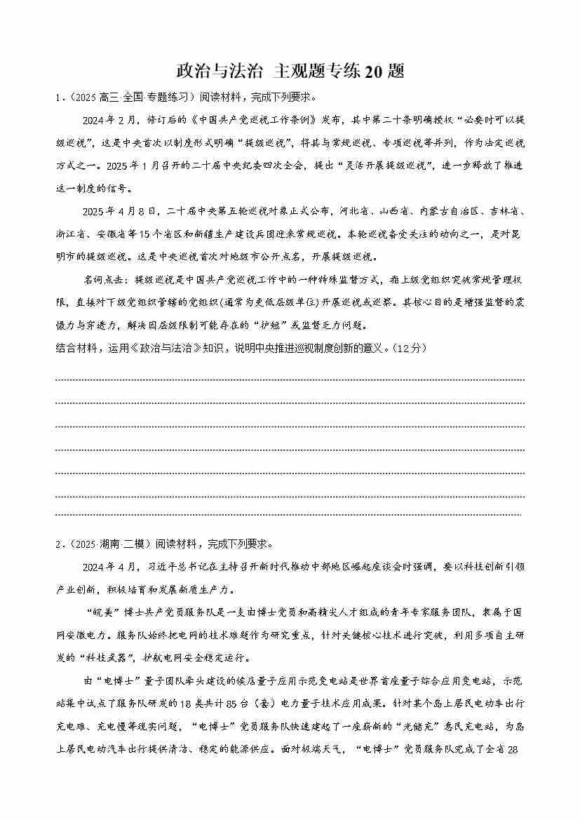 政治与法治 主观题专练20题 (学生版)(全国通用)