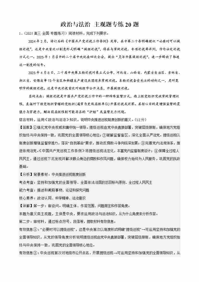 政治与法治 主观题专练20题 (教师版)(全国通用)