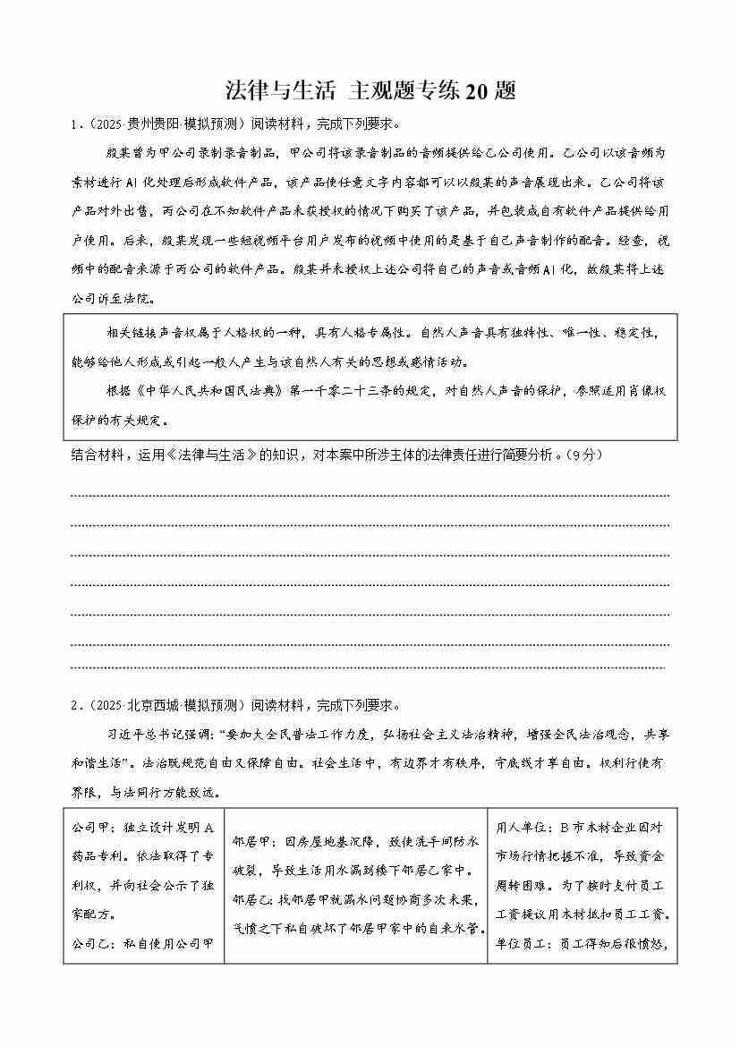 法律与生活 主观题专练20题(学生版)(全国通用)