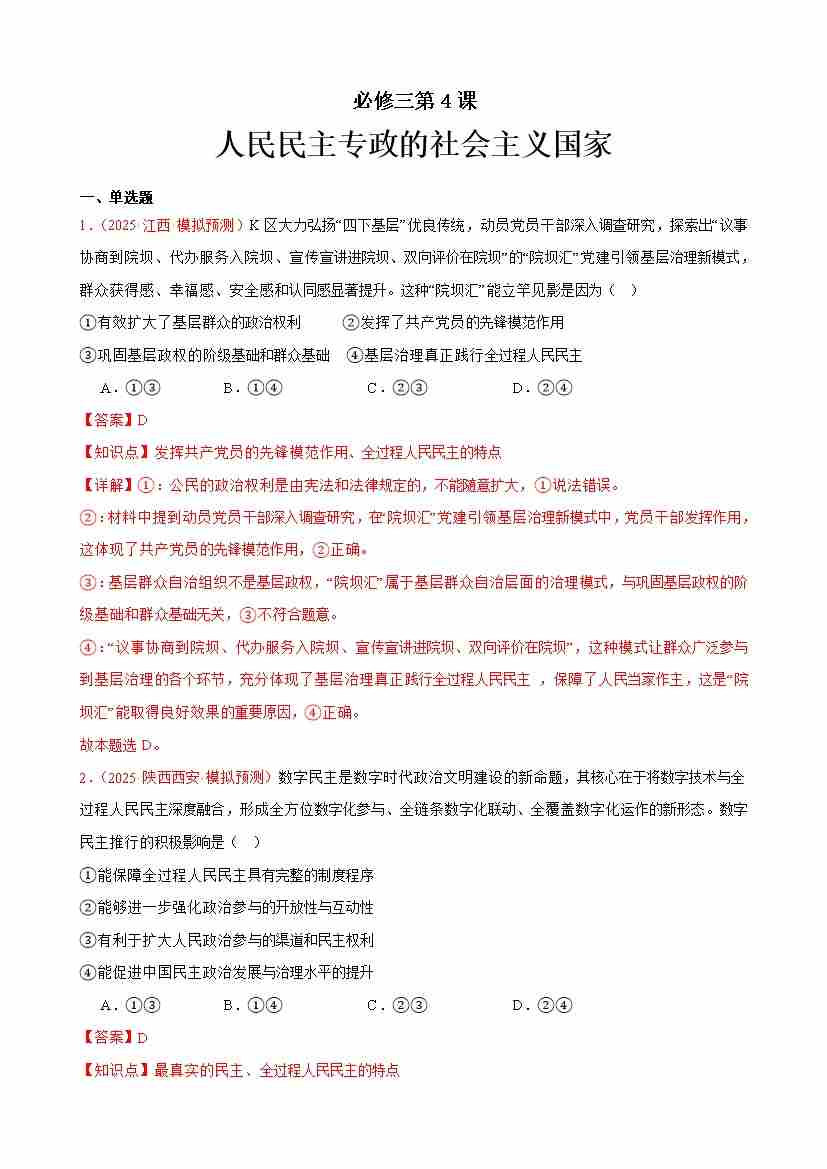 (第15练)必修三第4课人民民主专政的社会主义国家---(教师版)