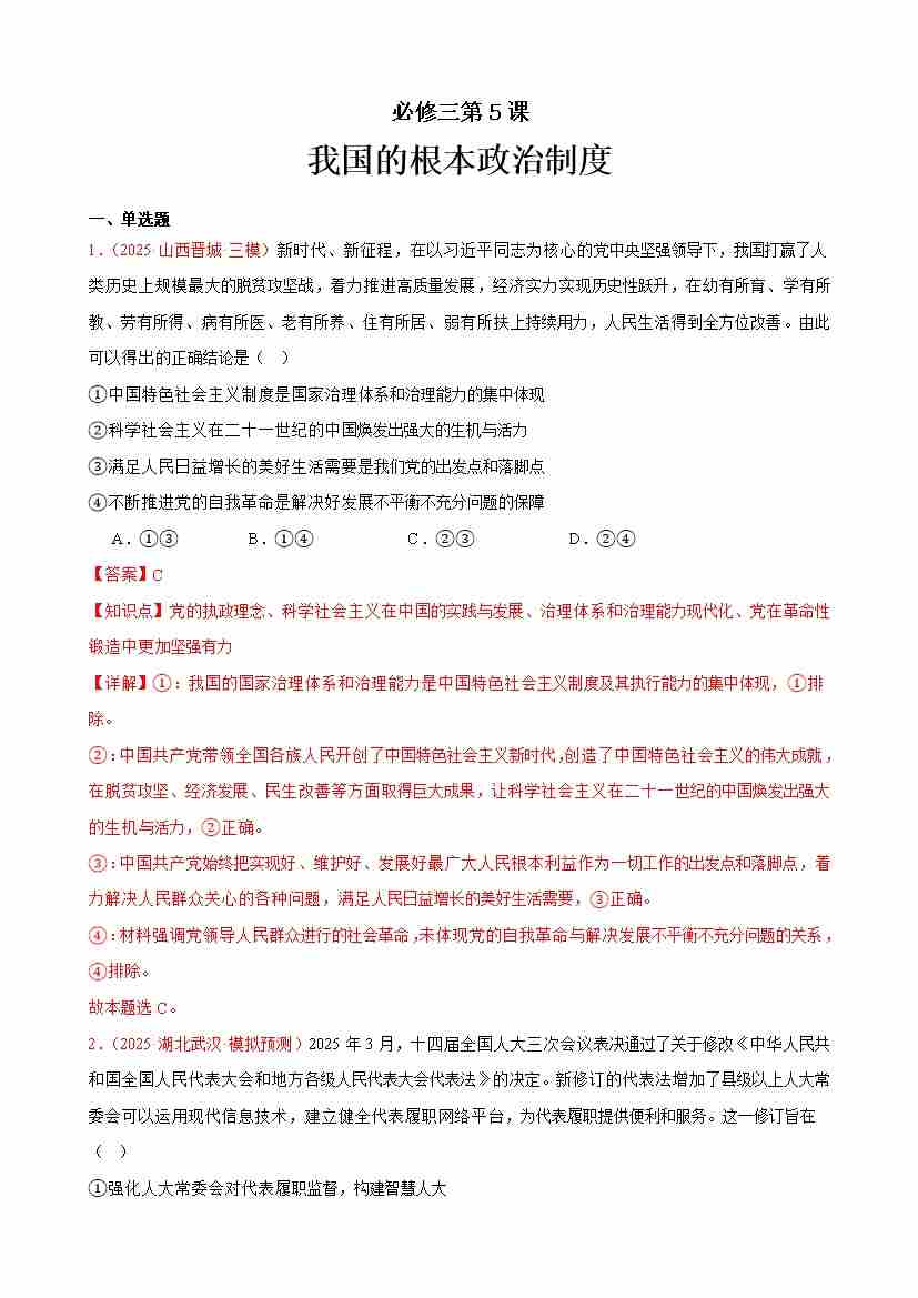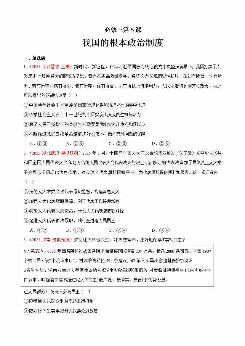 (第16练)必修三第5课我国的根本政治制度---(学生版)