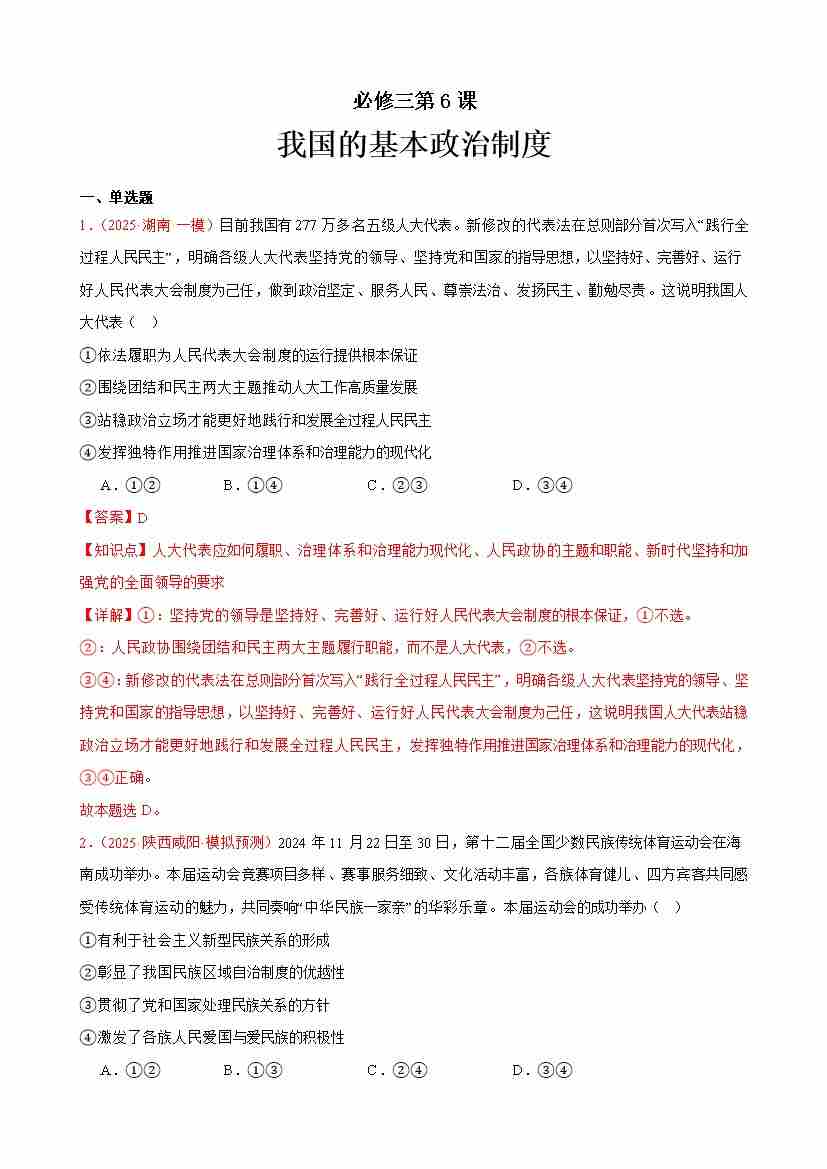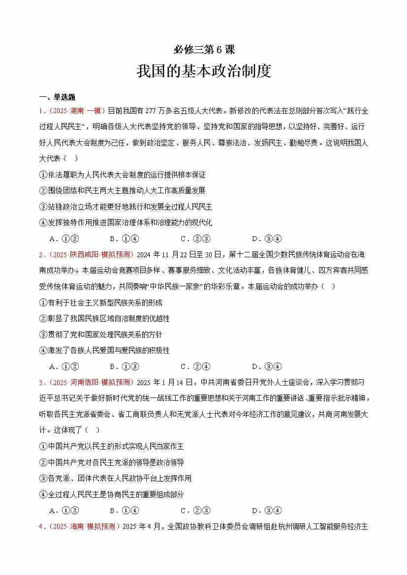 (第17练)必修三第6课我国的基本政治制度---(学生版)
