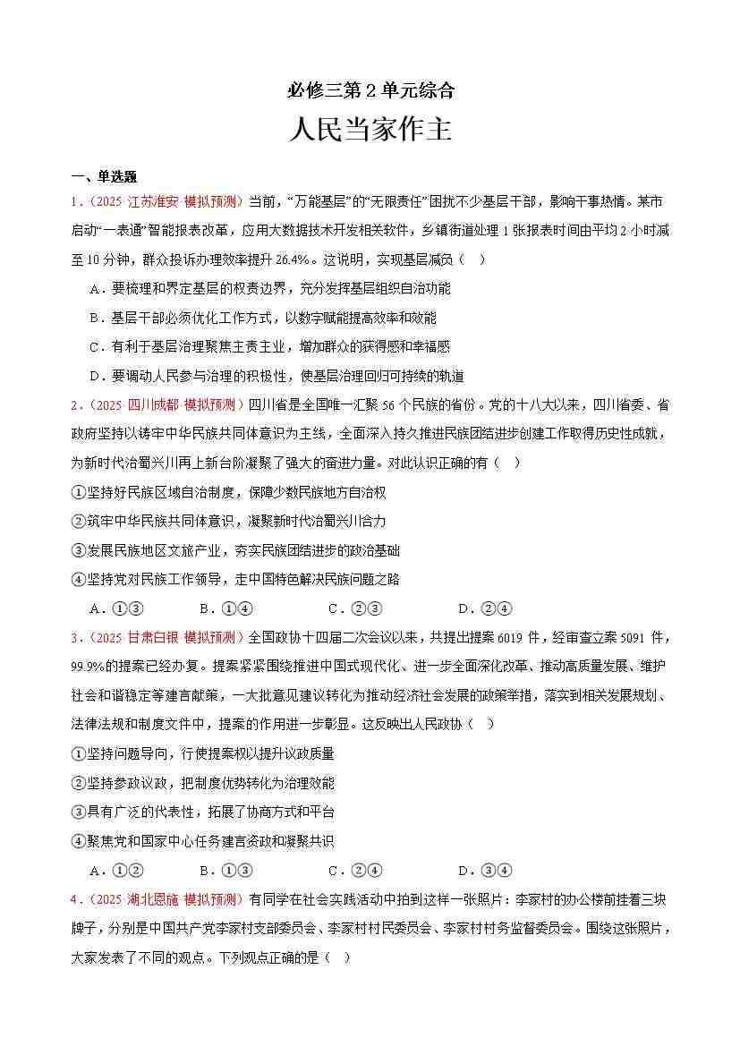 (第18练)必修三第2单元综合人民当家作主---(学生版)