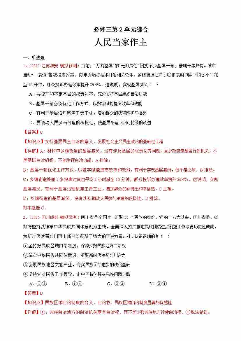 (第18练)必修三第2单元综合人民当家作主---(教师版)
