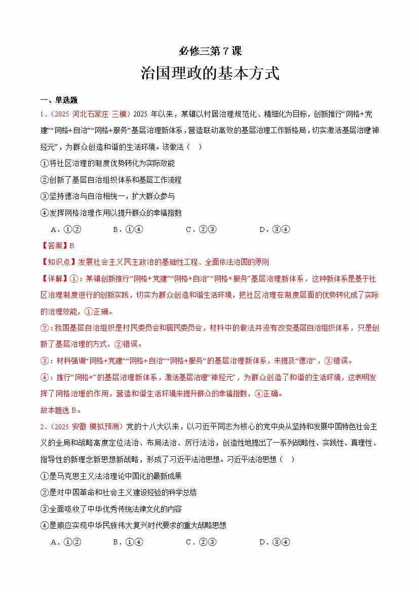 (第19练)必修三第7课治国理政的基本方式---(教师版)