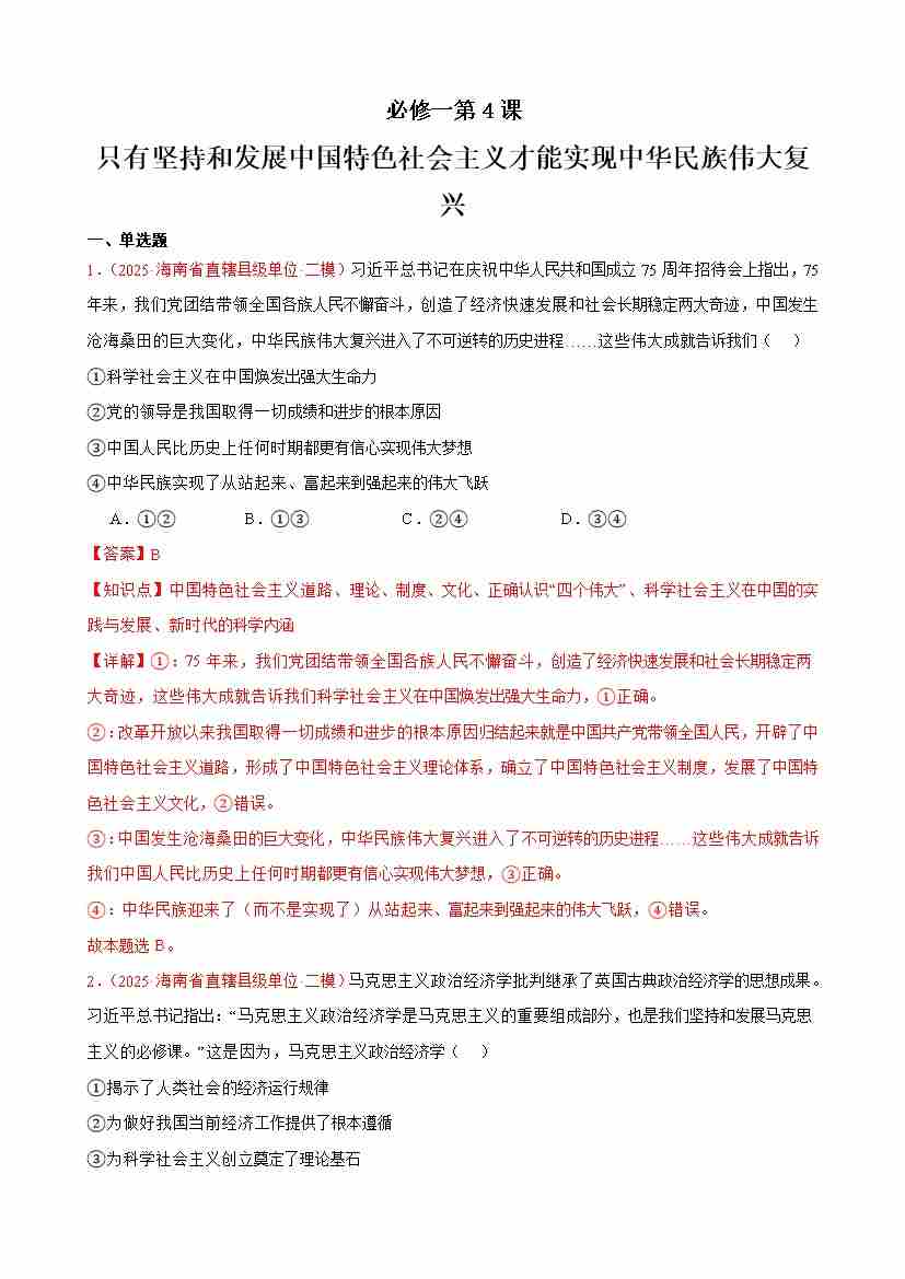 (第4练)必修一第4课只有坚持和发展中国特色社会主义才能实现中华民族伟大复兴---(教师版)