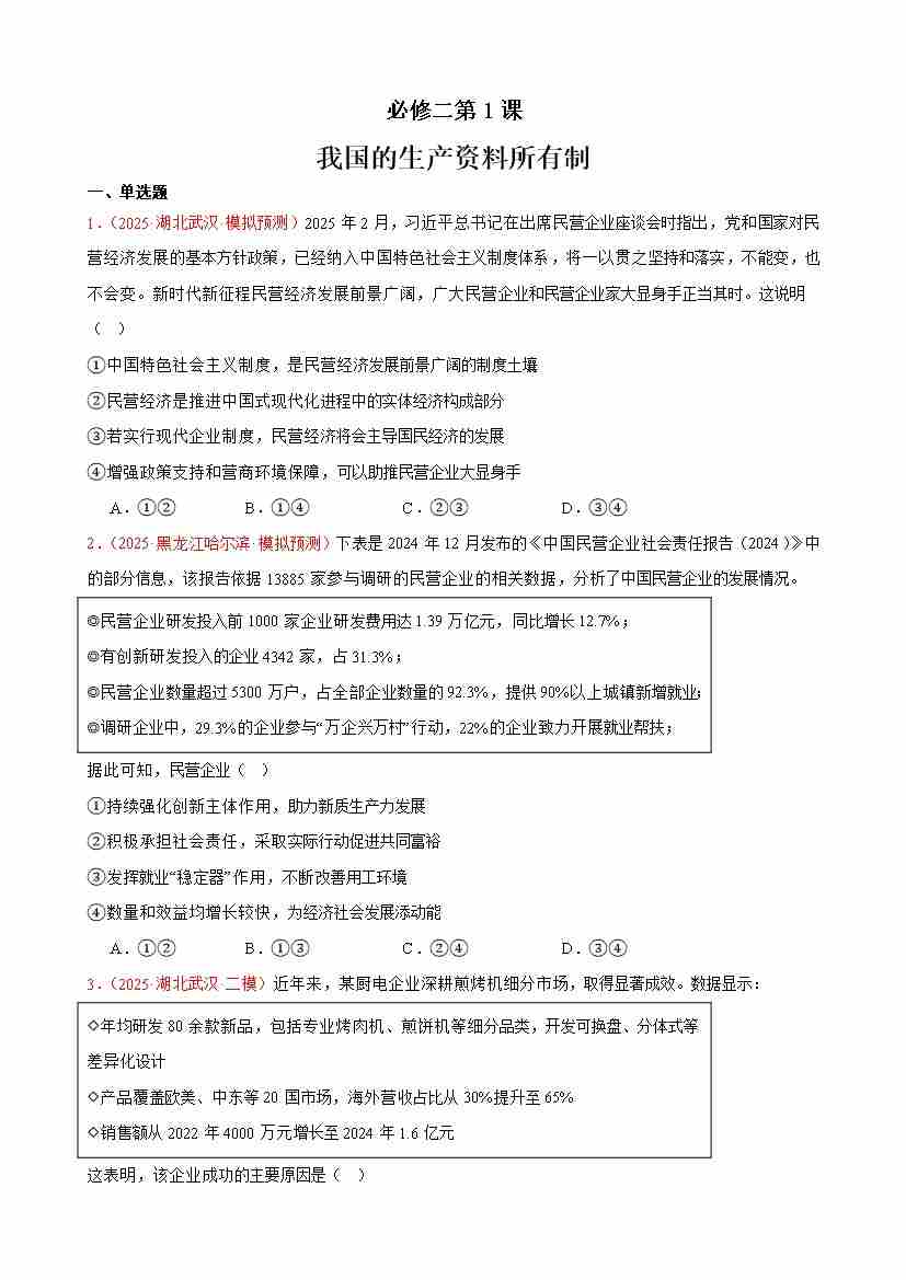 (第5练)必修二第1课我国的生产资料所有制---(学生版)