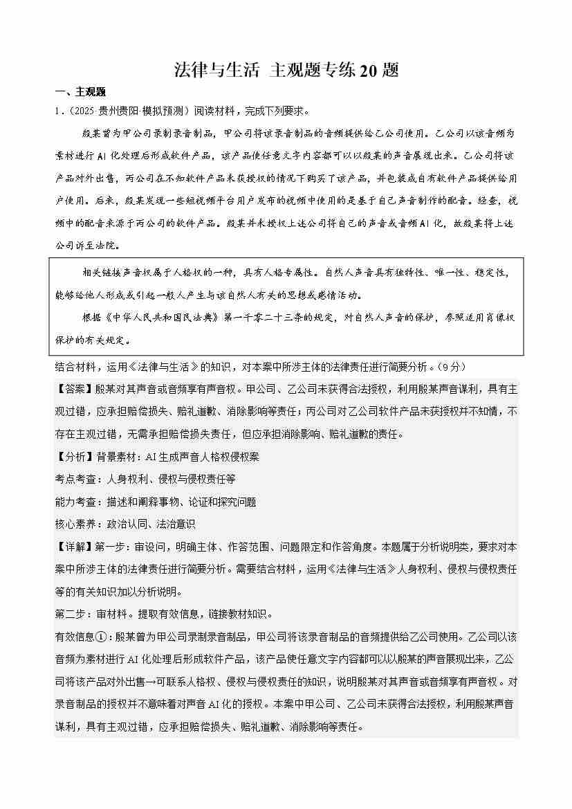 法律与生活 主观题专练20题(教师版)(全国通用)
