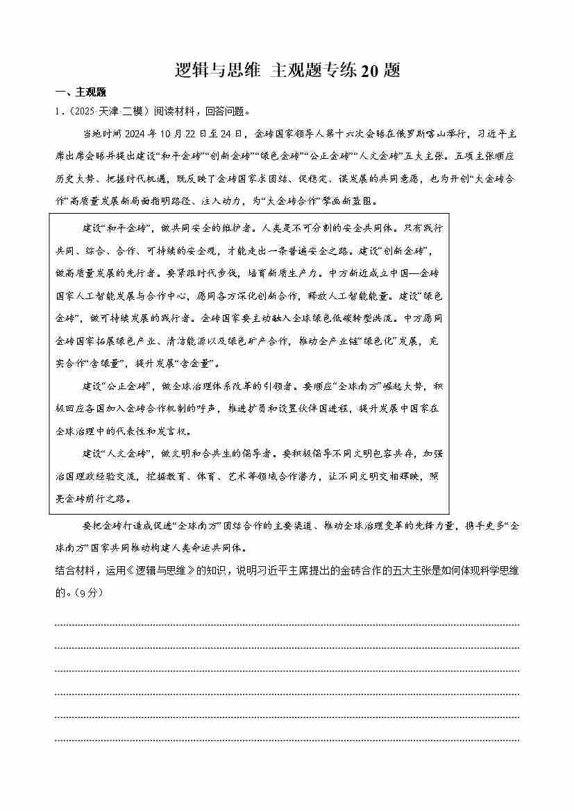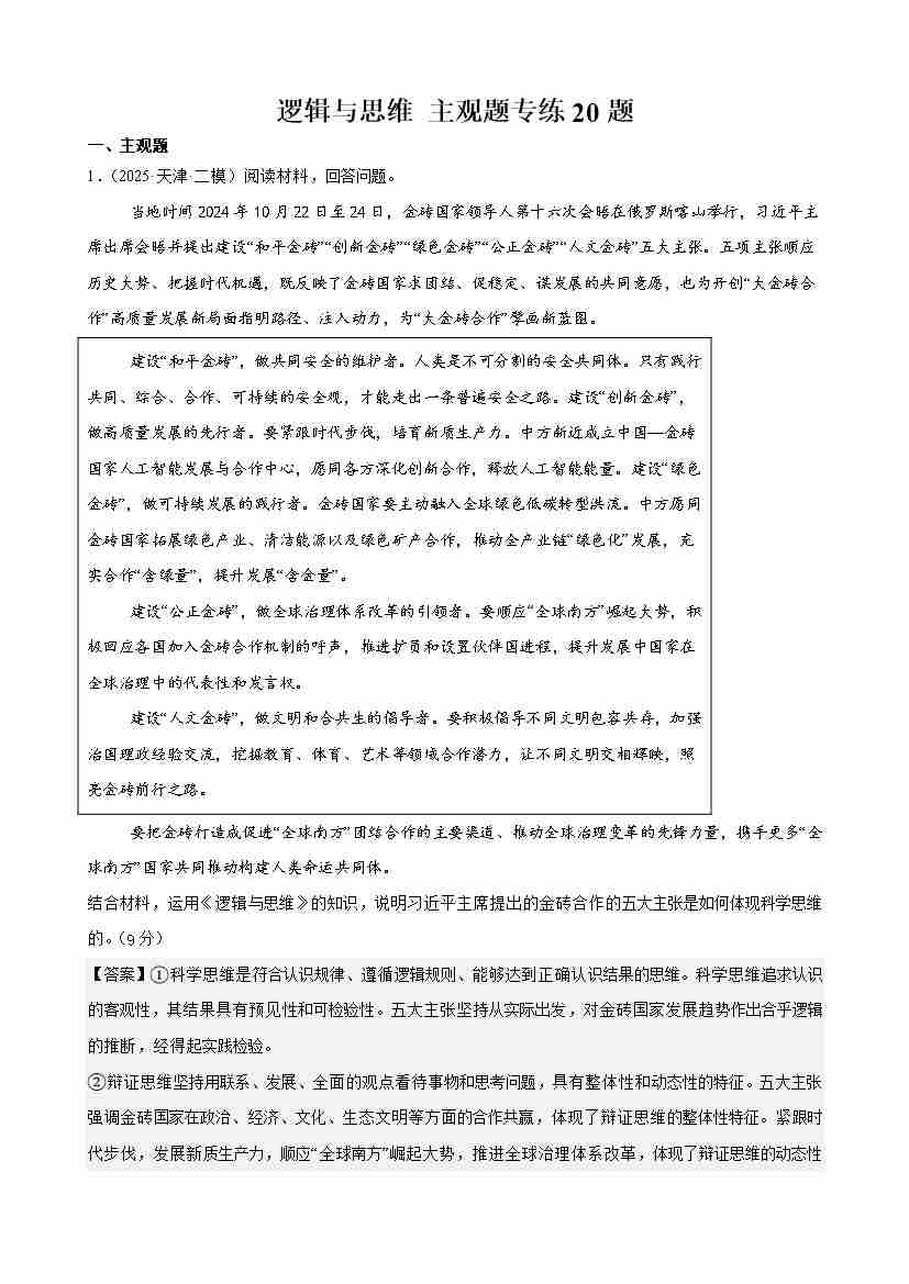 逻辑与思维 主观题专练20题(学生版)(全国通用)