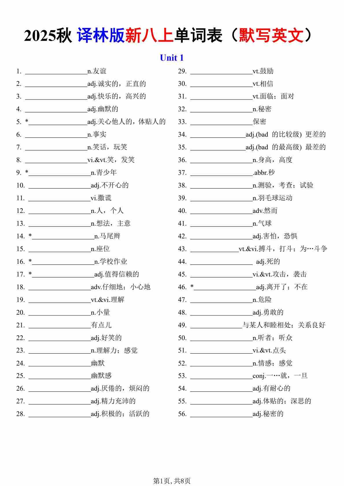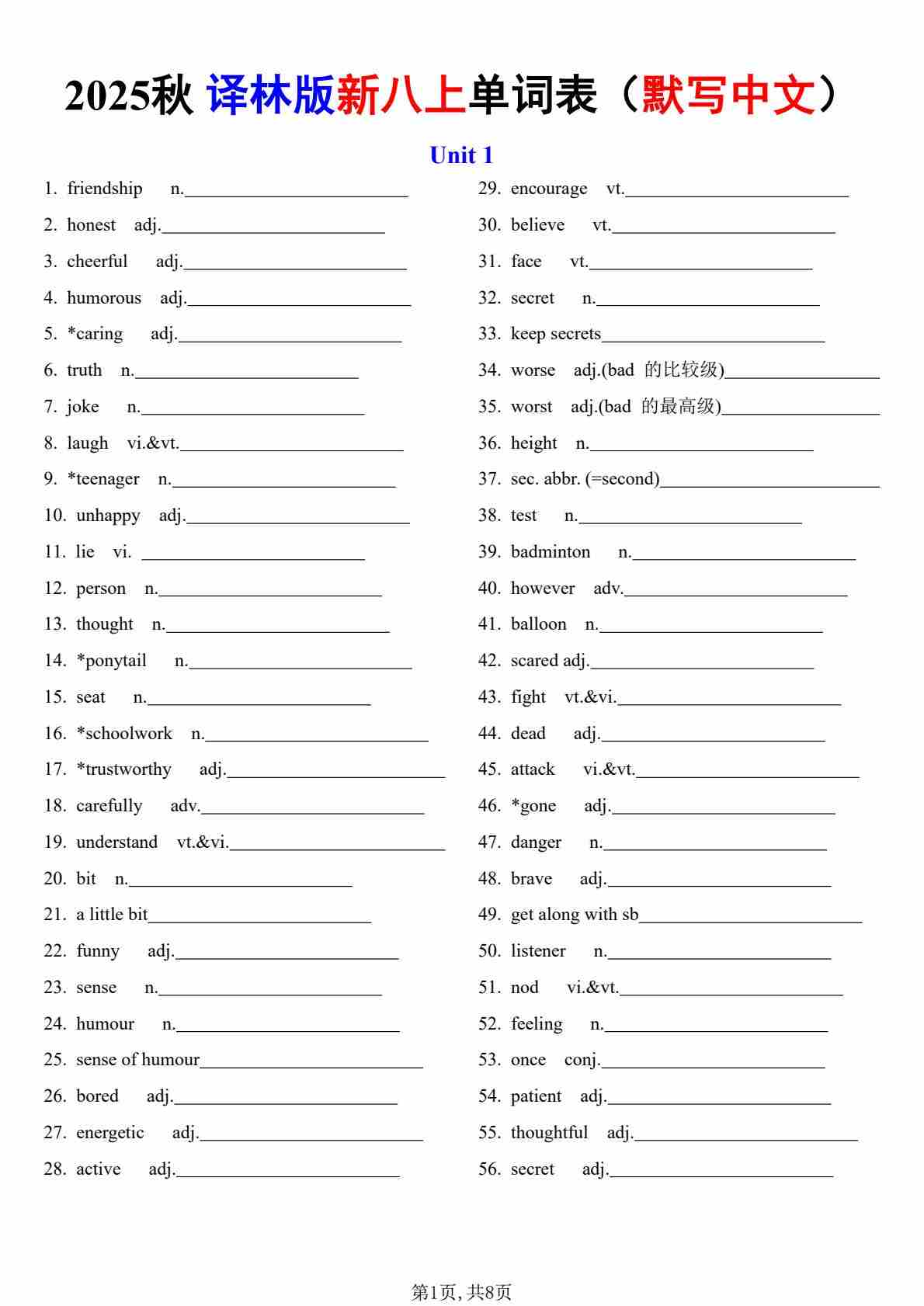 新译林版八上单词表 (默写中文)(1)