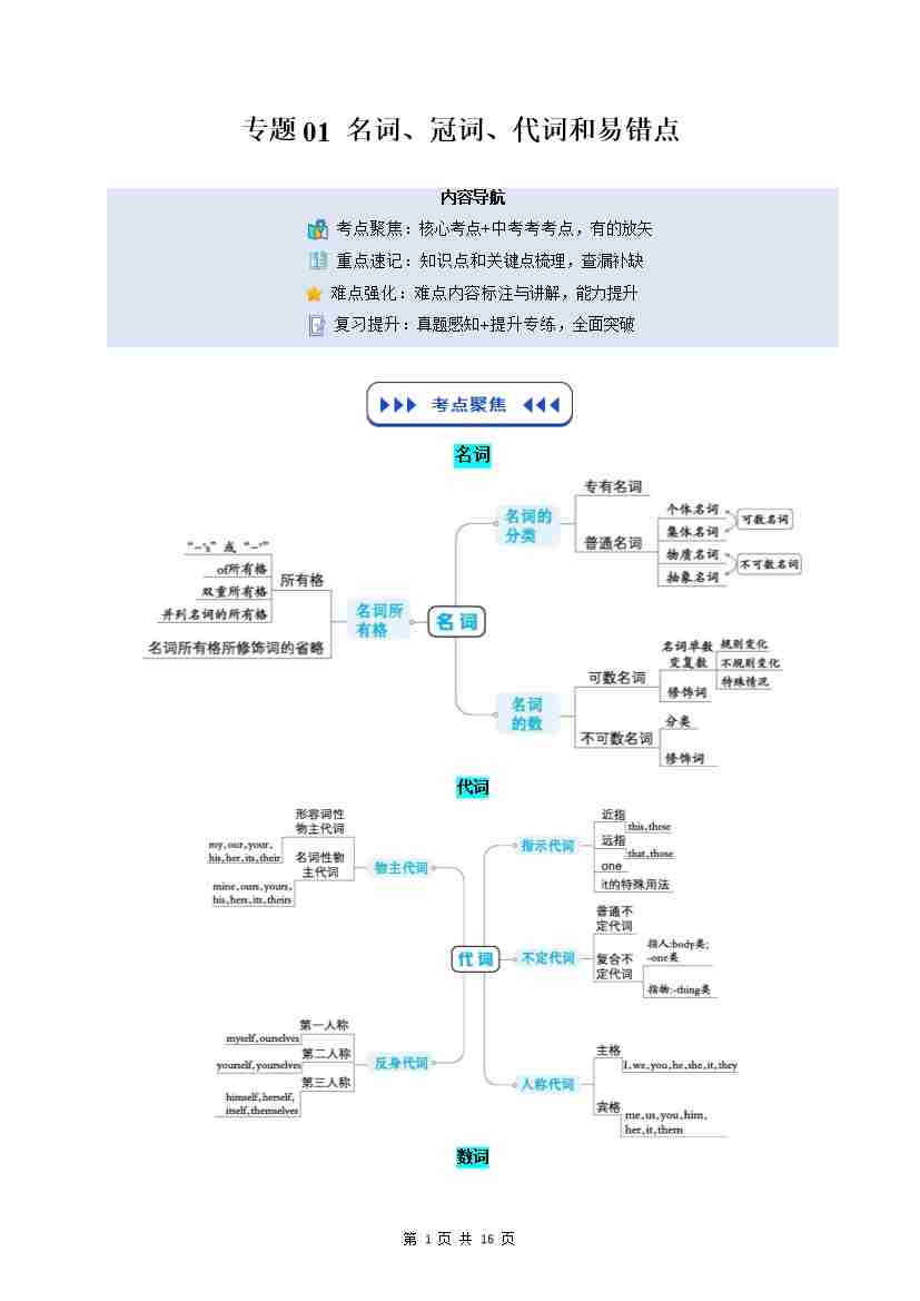 (复习部分)专题01 名词、代词、数词和易错点(原卷版)