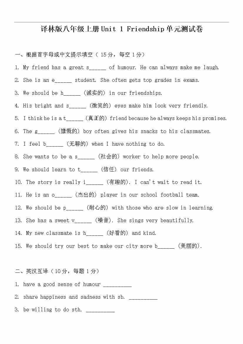 Unit 1 Friendship单元测试卷(含答案)