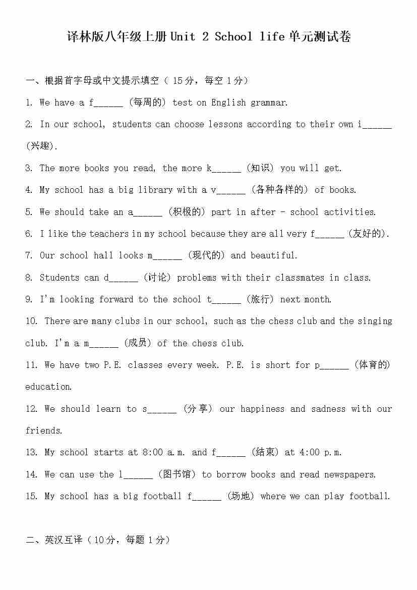 Unit 2 School life单元测试卷(含答案)
