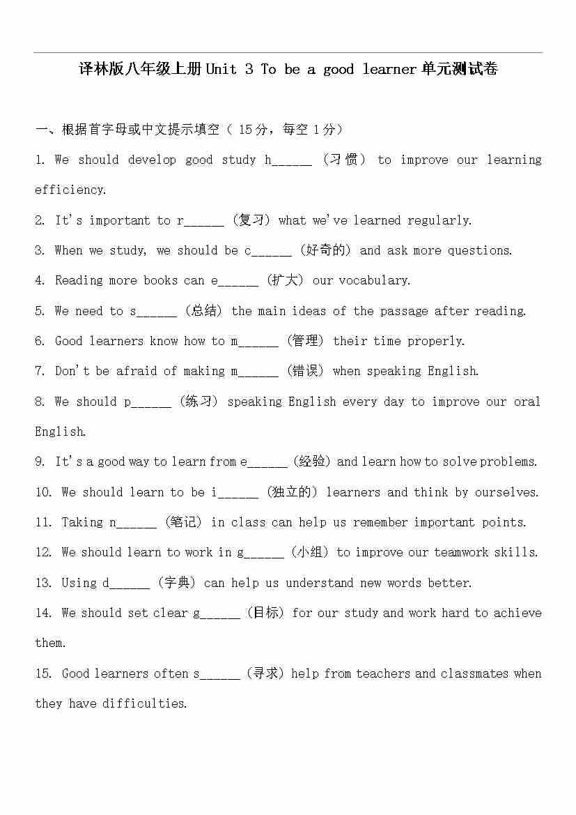 Unit 3 To be a good learner 单元测试卷(含答案)