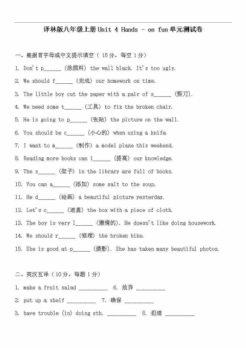 Unit 4 Hands-on fun 单元测试卷(含答案)