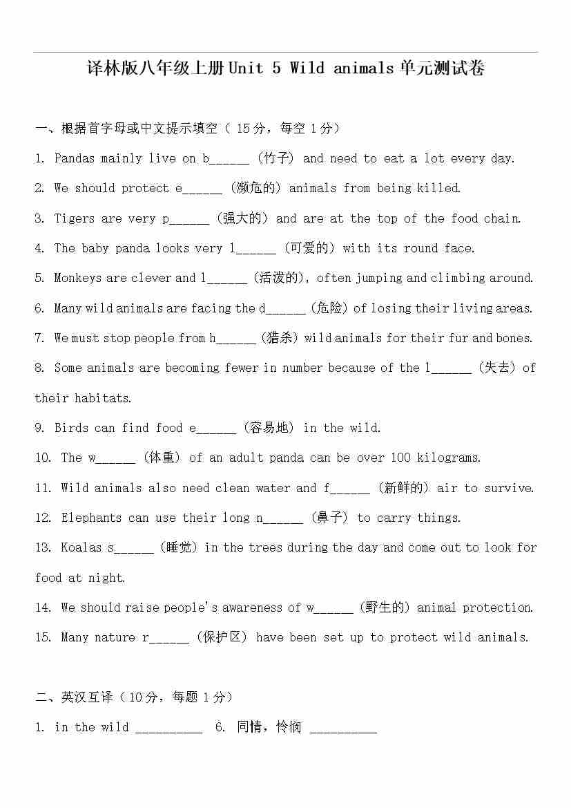 Unit 5 Wild animals 单元测试卷(含答案)