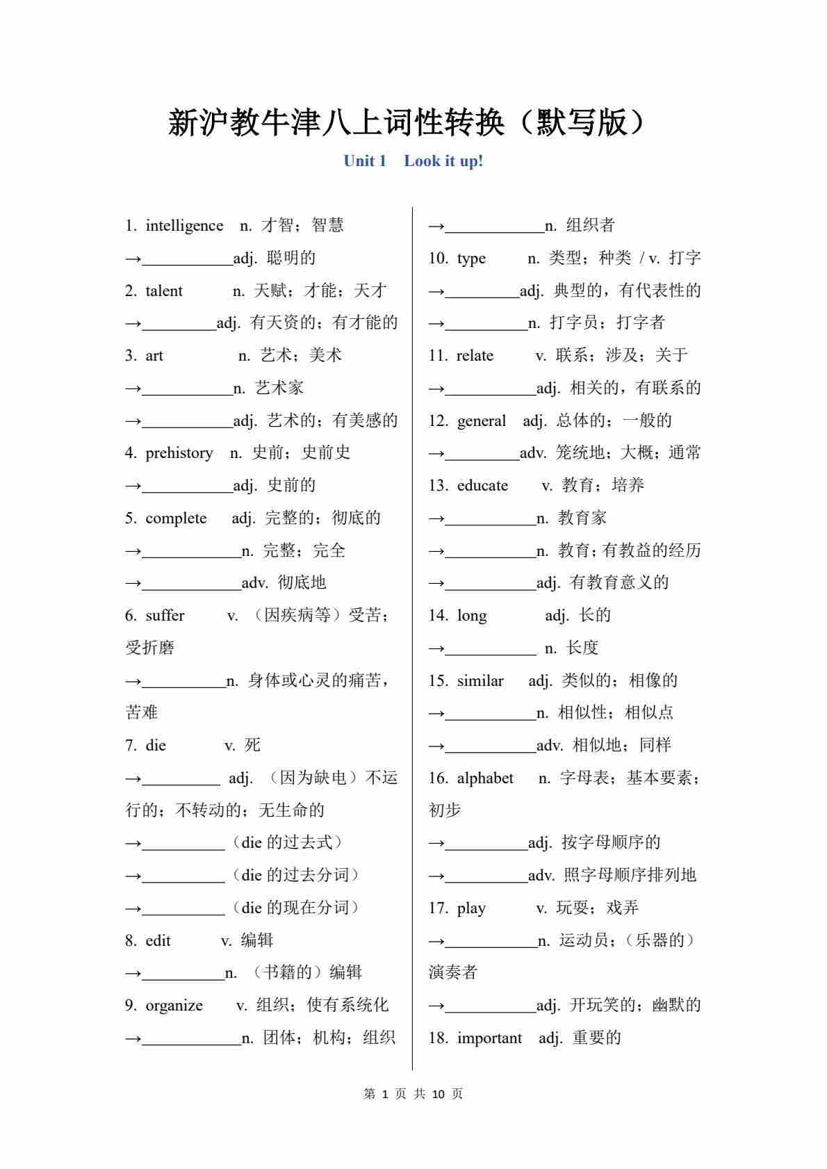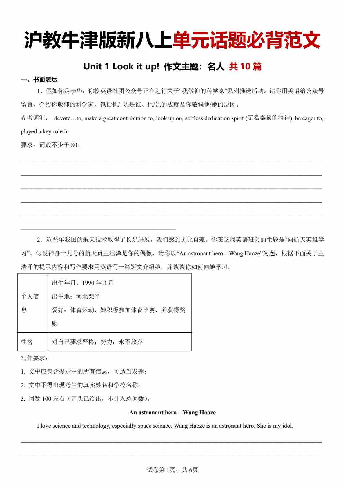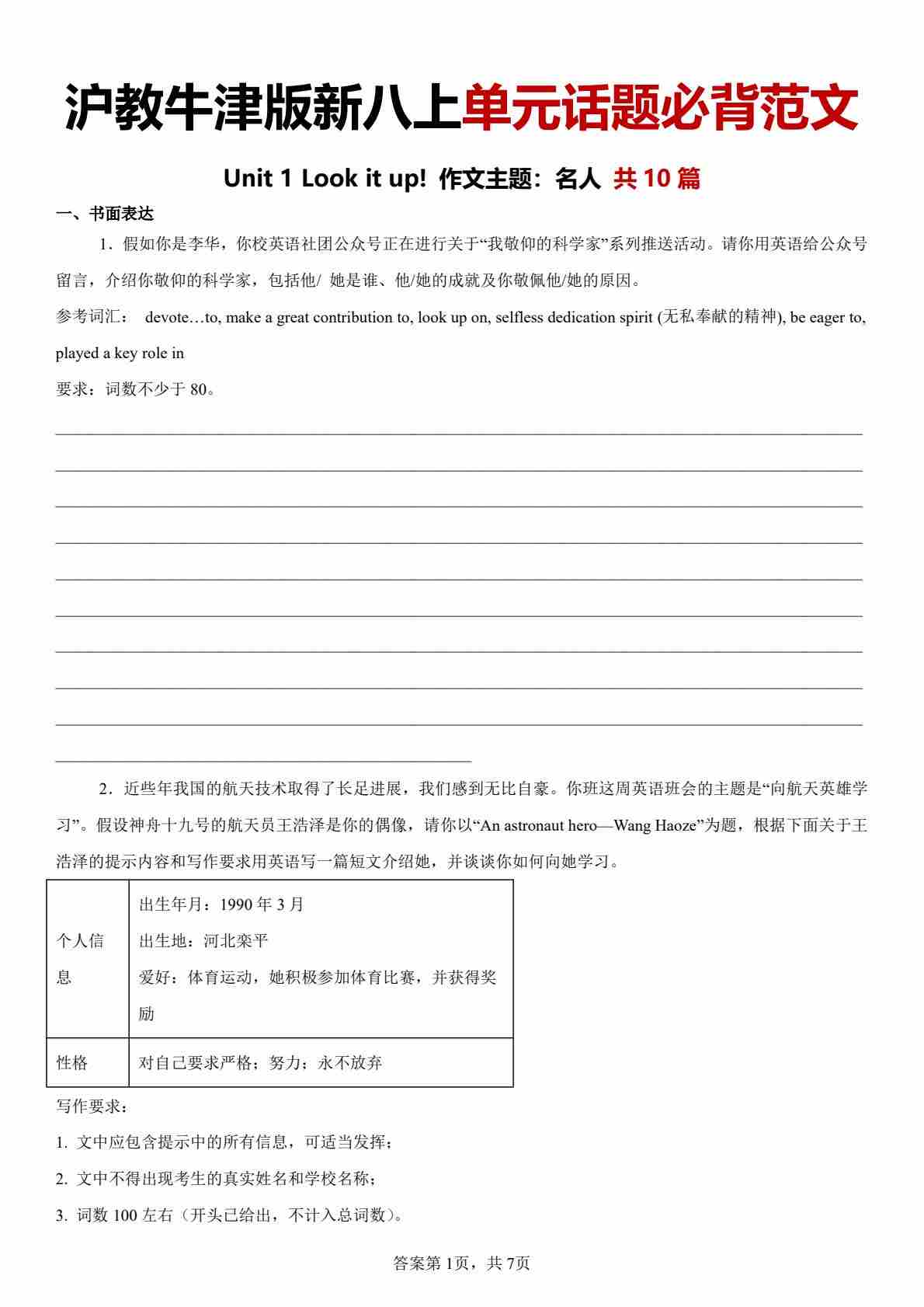 Unit 1 作文主题:名人-沪教牛津版新八上单元话题必背范文(教师版)