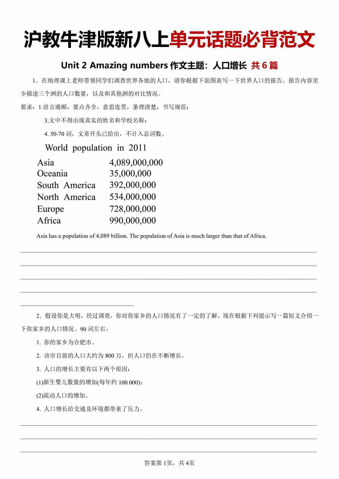 Unit 2 作文主题:人口增长-沪教牛津版新八上单元话题必背范文(教师版)