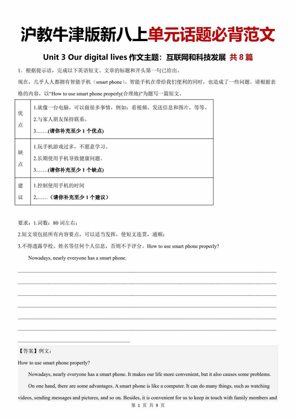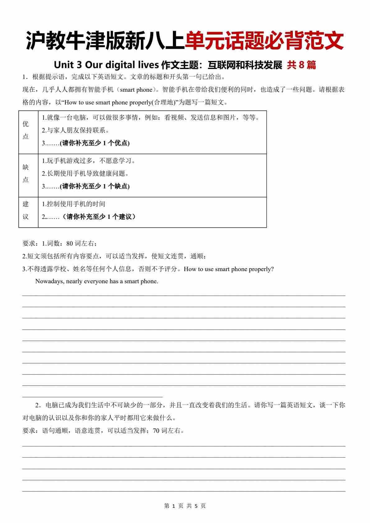 Unit 3 作文主题:互联网和科技的发展-沪教牛津版新八上单元话题必背范文(教师版)