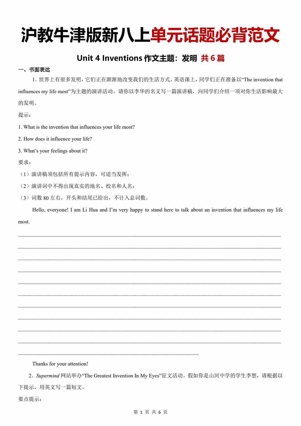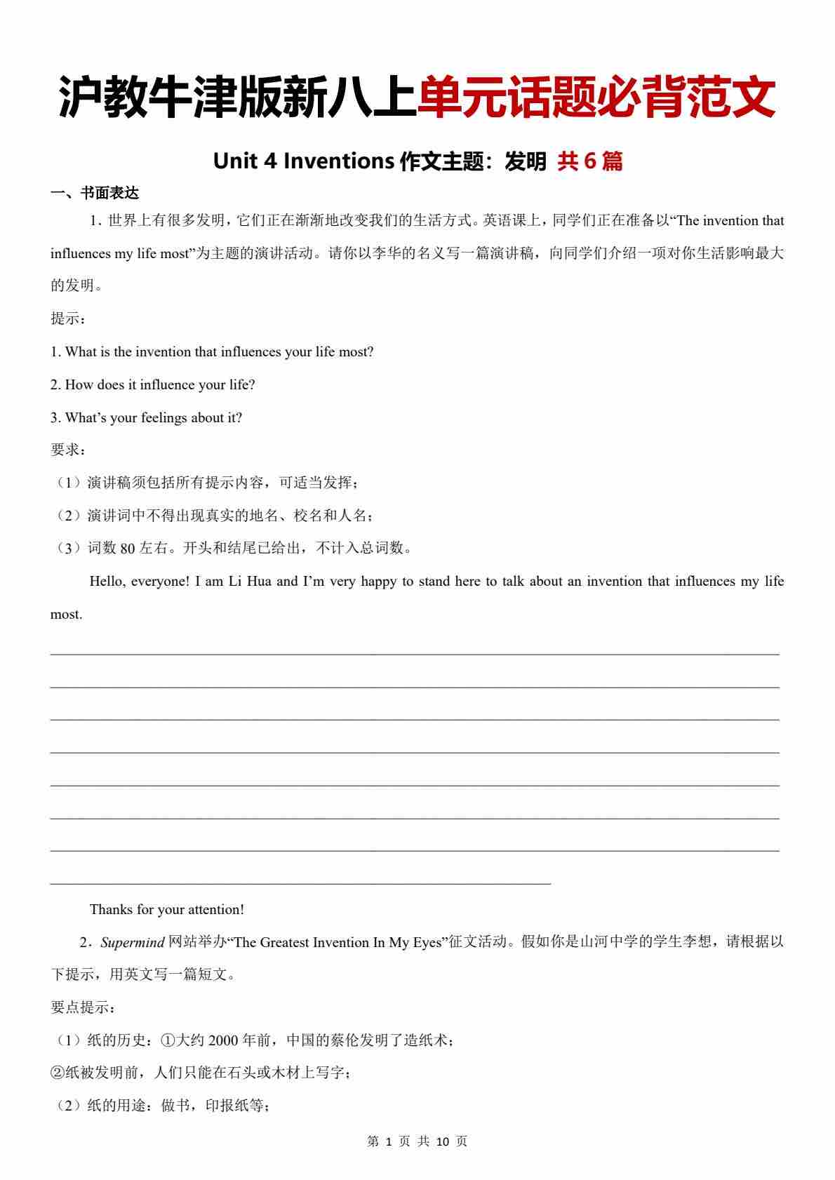 Unit 4 作文主题:发明-沪教牛津版新八上单元话题必背范文(教师版)