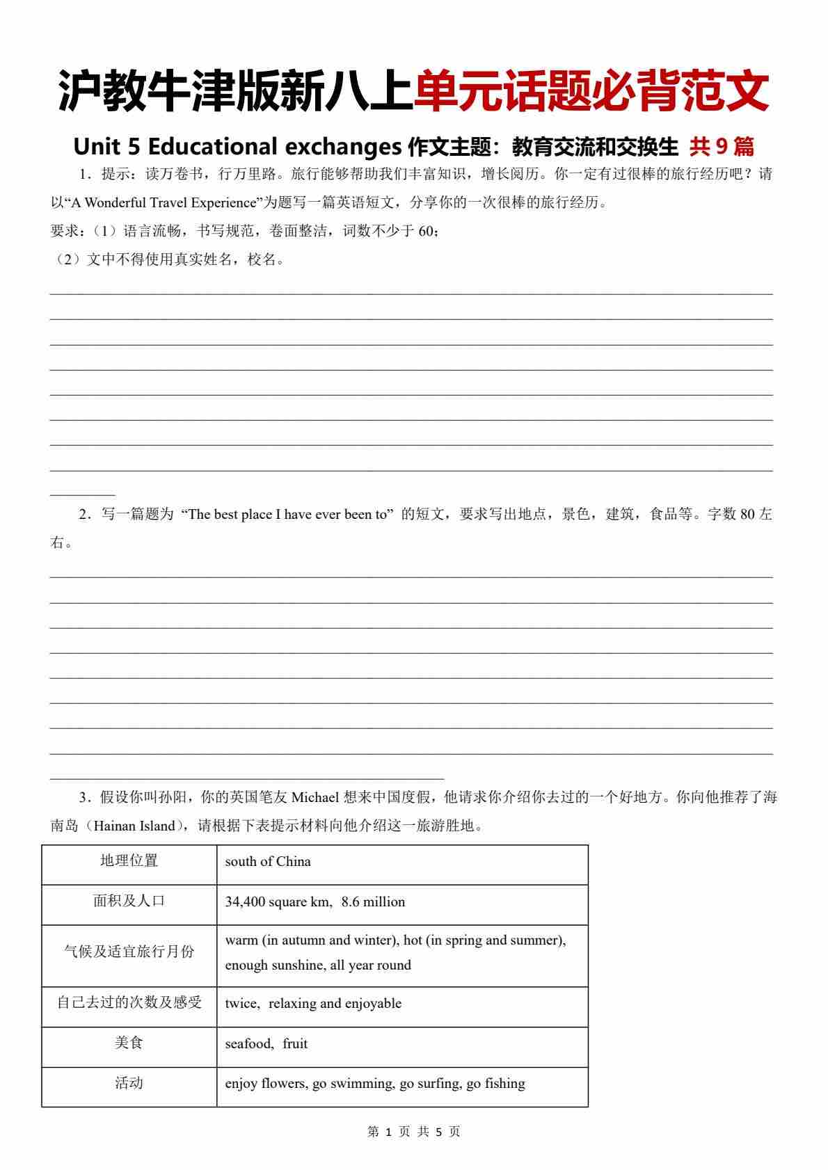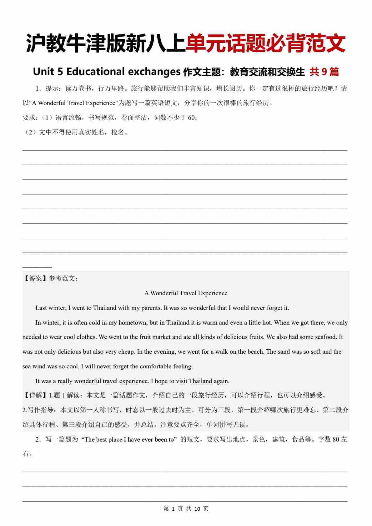 Unit 5 作文主题:交换生-沪教牛津版新八上单元话题必背范文(教师版)
