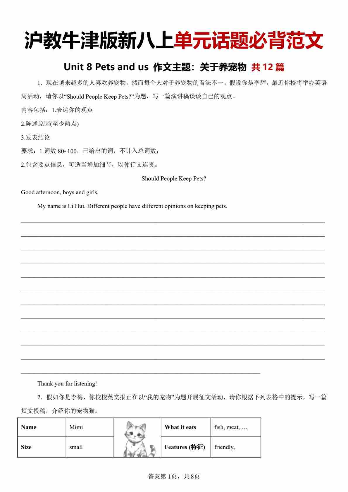 Unit 8 作文主题:关于养宠物-沪教牛津版新八上单元话题必背范文(教师版)
