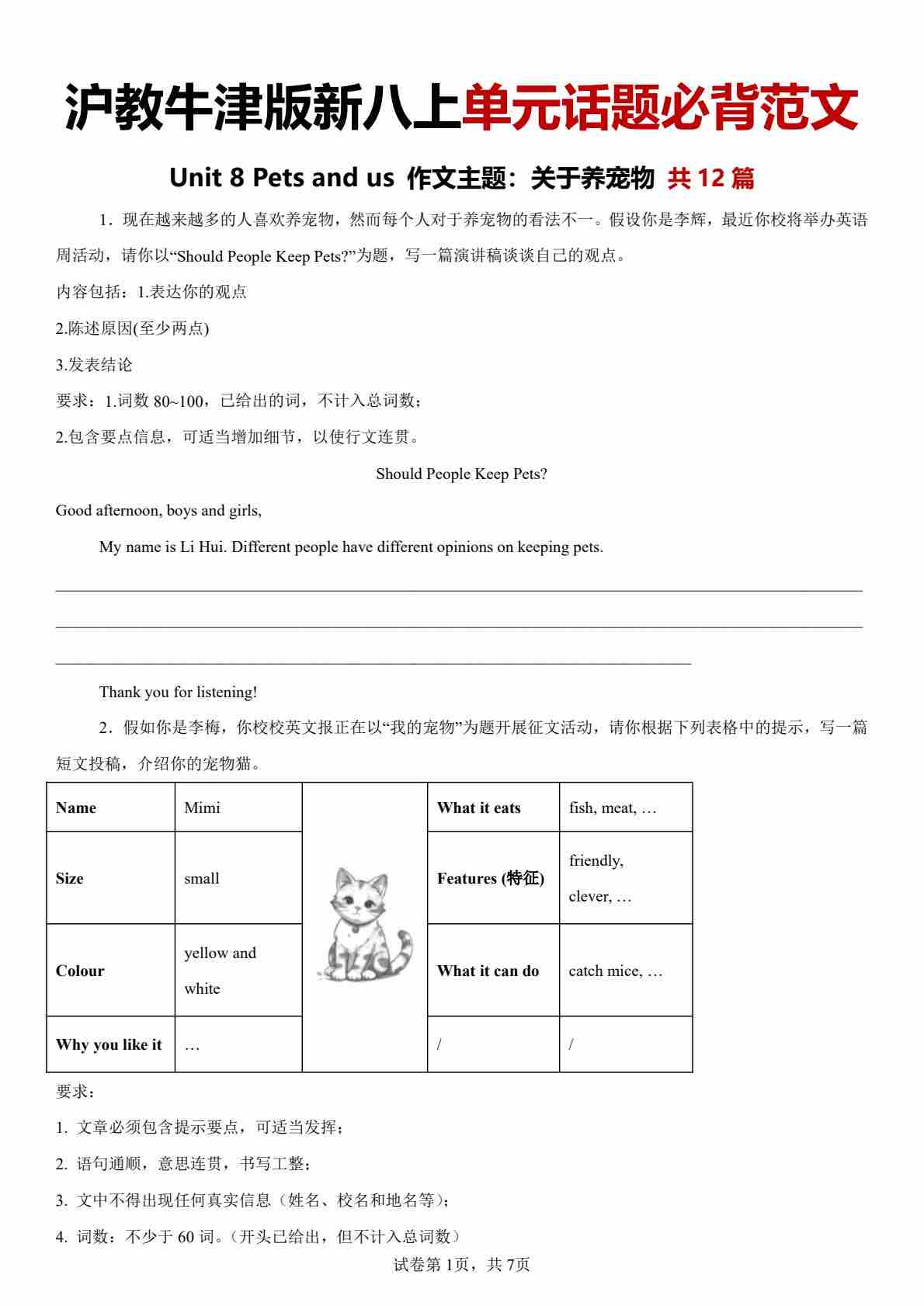 Unit 8 作文主题:关于养宠物-沪教牛津版新八上单元话题必背范文(学生版)