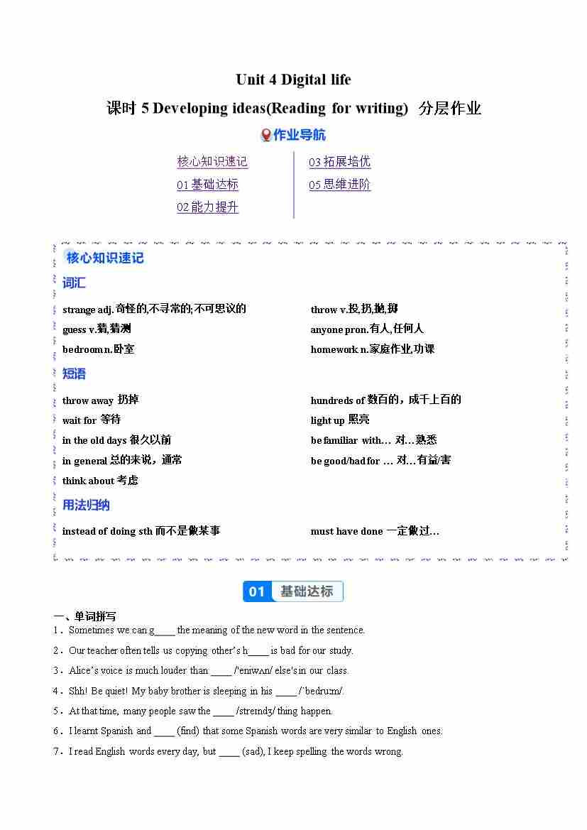 Unit 4 课时5 Developing ideas(Reading for writing)(分层作业)(原卷版)