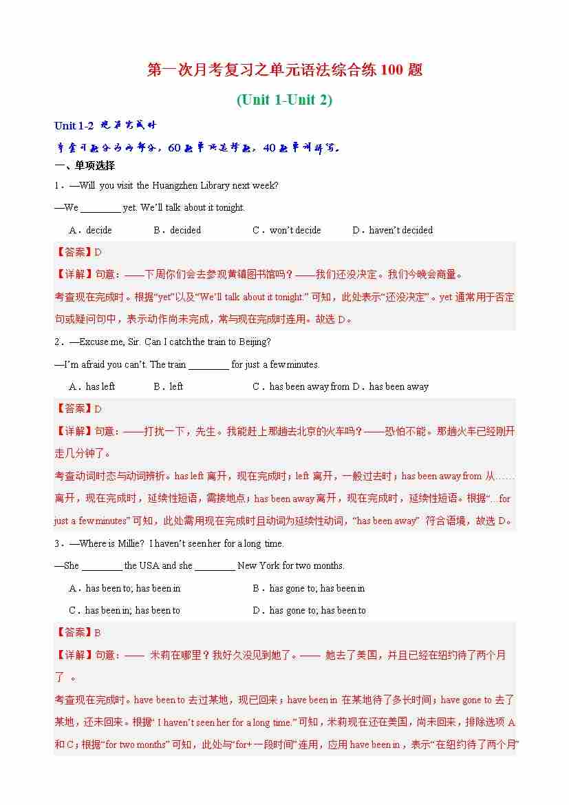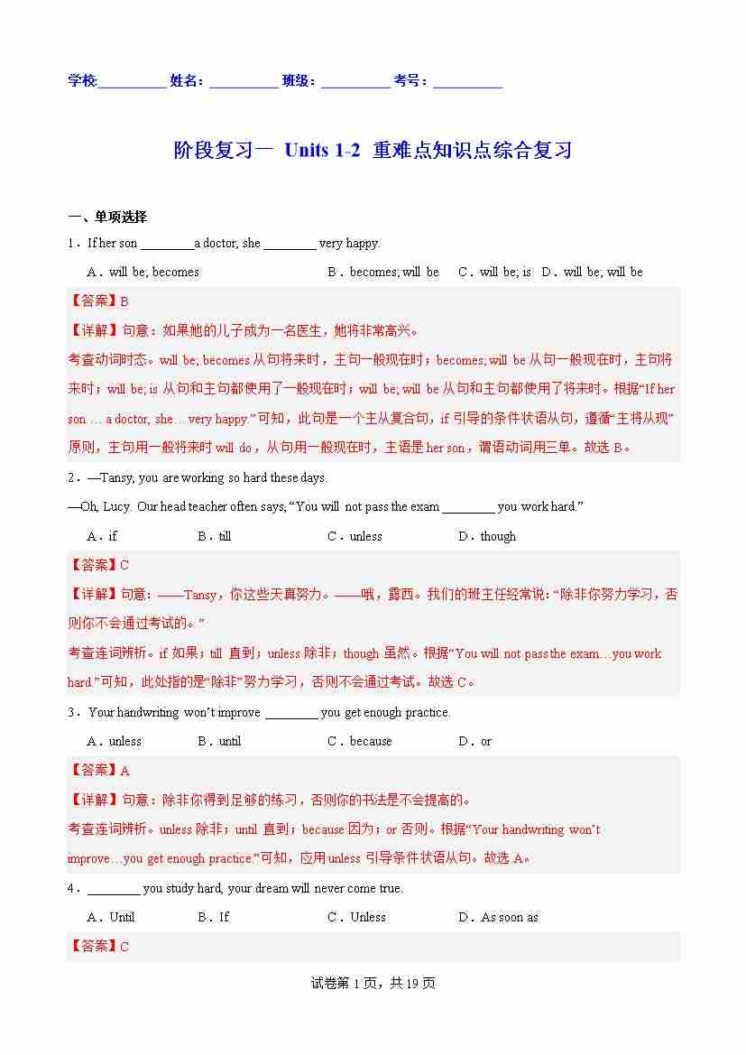 第03部分:阶段复习一 Units 1-2 重难点知识点综合复习(教师版)