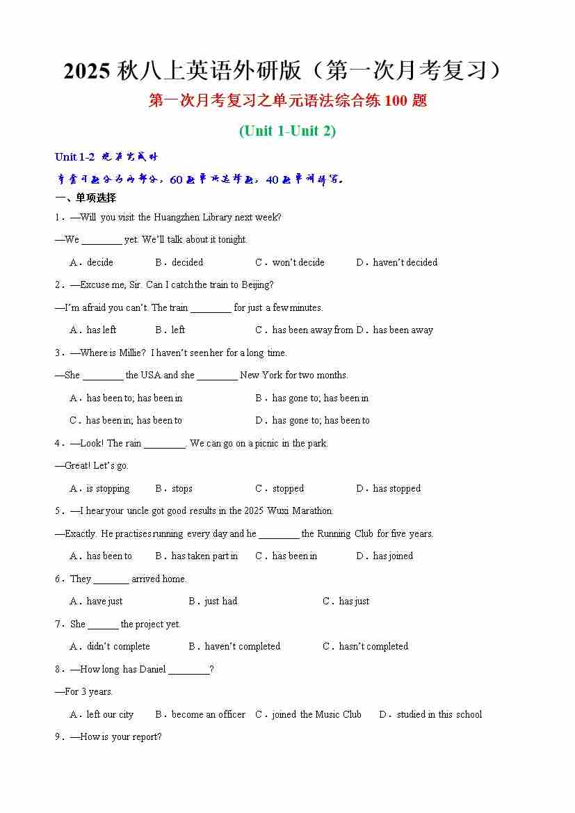 八上外研第一次月考复习(Unit1-Unit2)-----合并版外研.