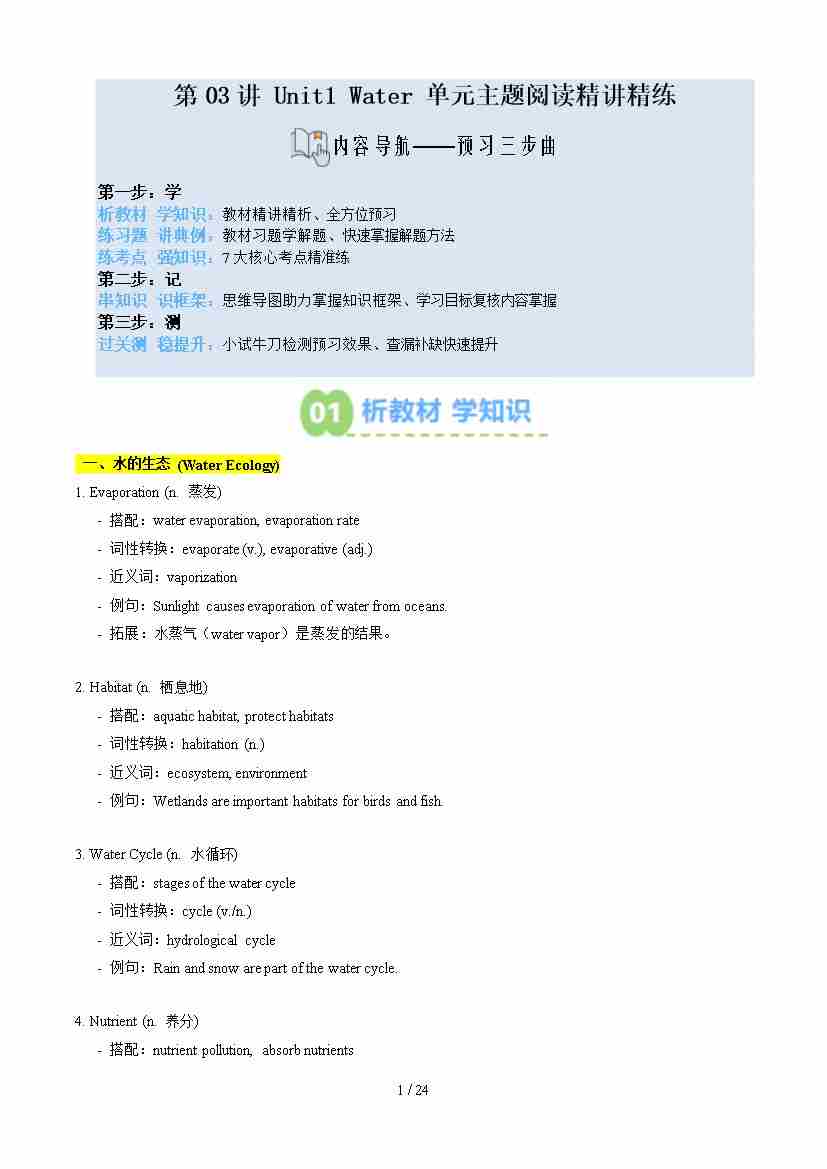 第02部分-新知预习:第03讲 Unit1 Water 单元主题阅读精讲精练(学生版)