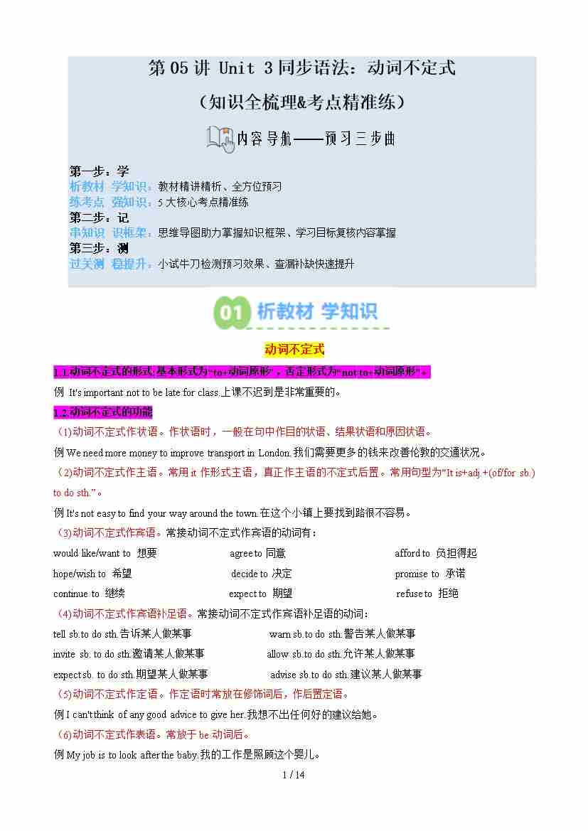 第02部分-新知预习:第05讲 Unit 3 同步语法:动词不定式(学生版)