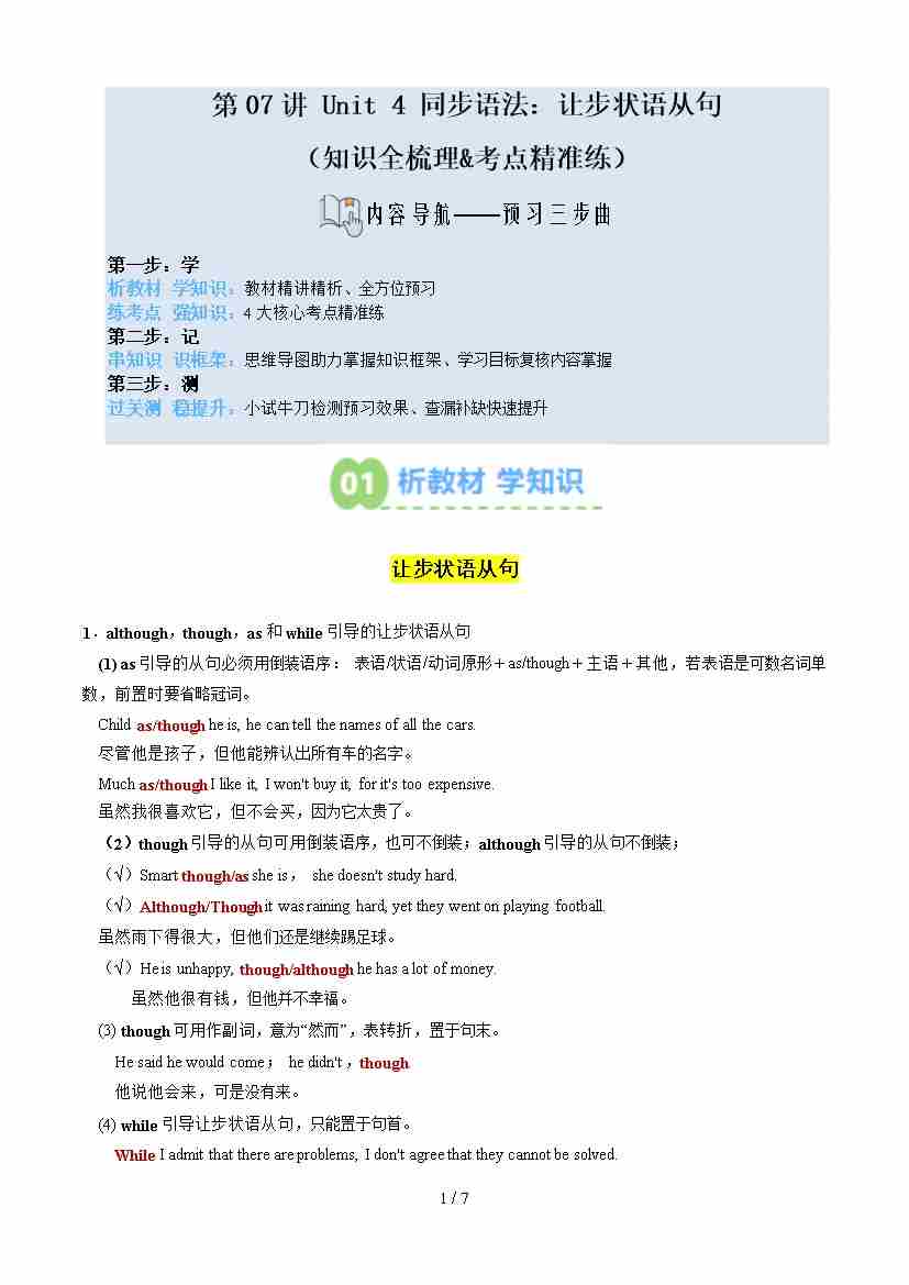 第02部分-新知预习:第07讲 Unit 4 同步语法:让步状语从句(学生版)