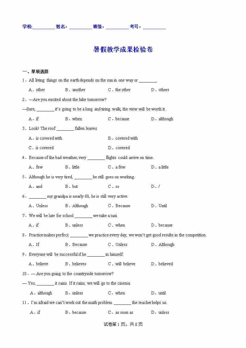 第03部分:暑假教学成果检验卷(学生版)