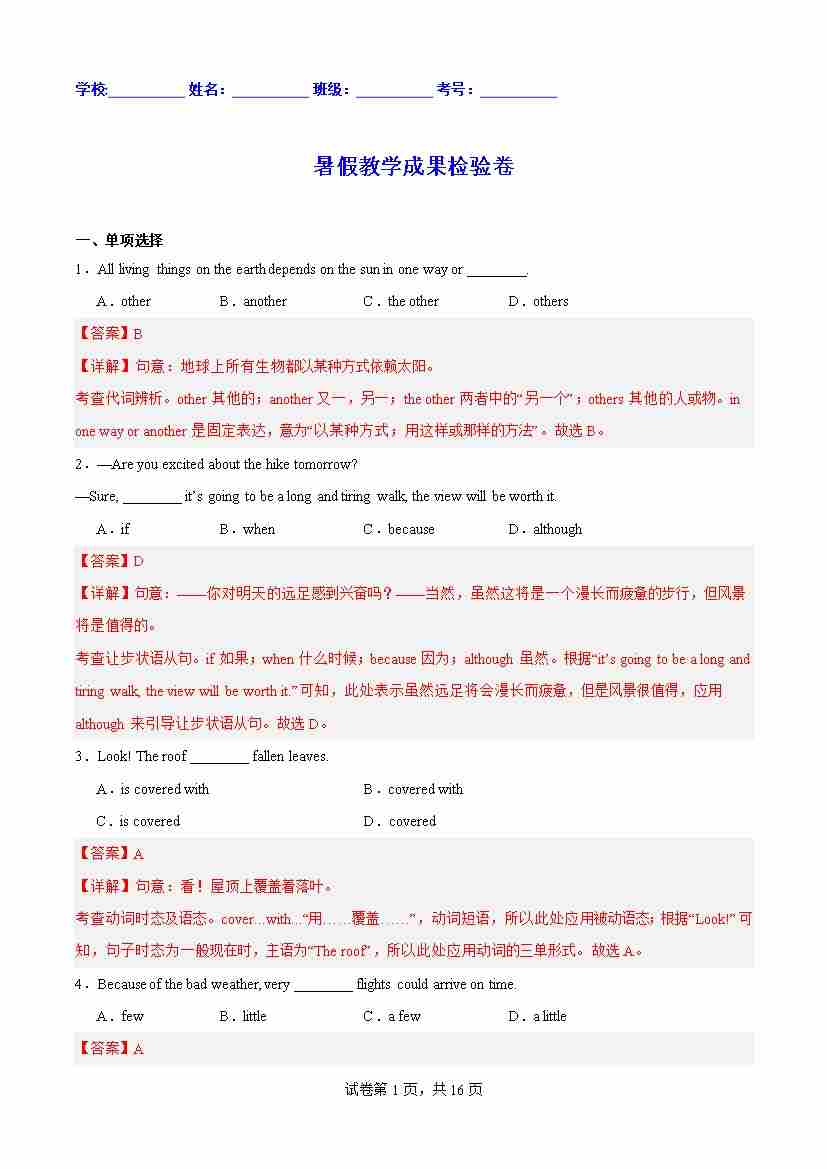 第03部分:暑假教学成果检验卷(教师版)