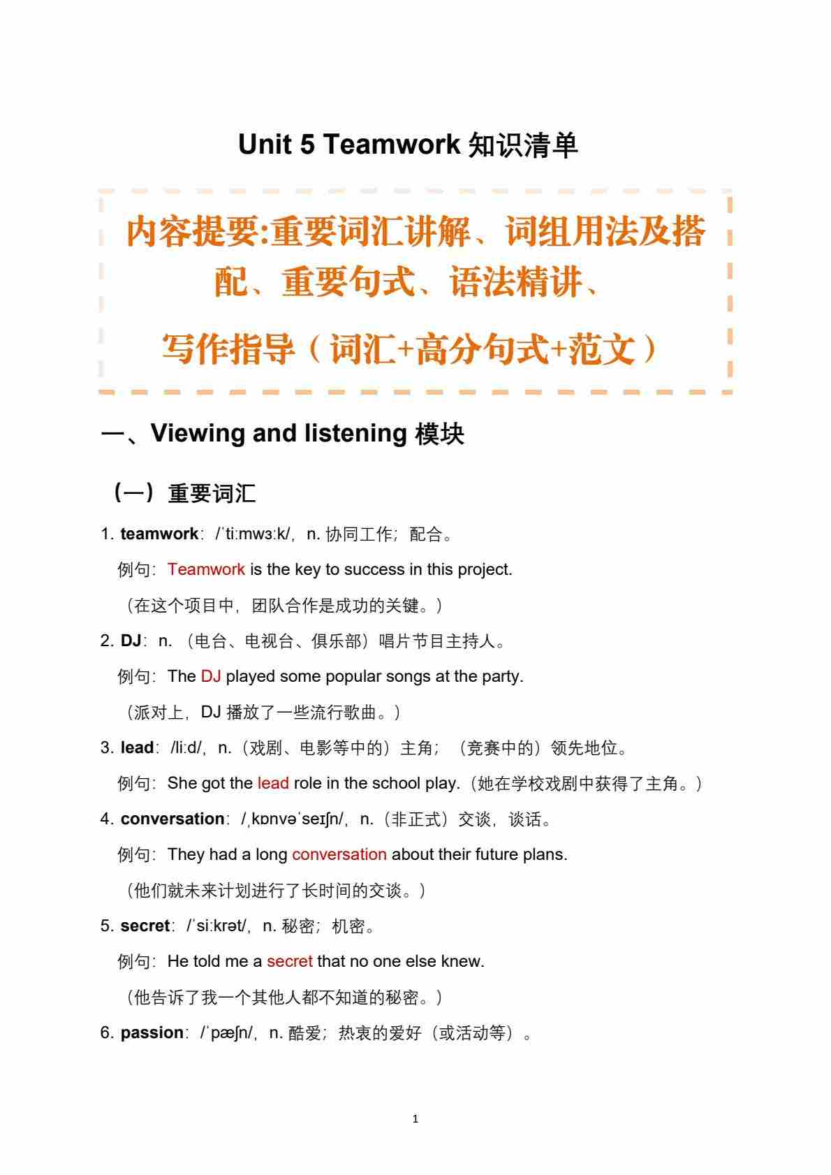 Unit 5 Teamwork 知识清单(详细版)(含书面表达))【沪教版(五四学制)(2024)八上英语】