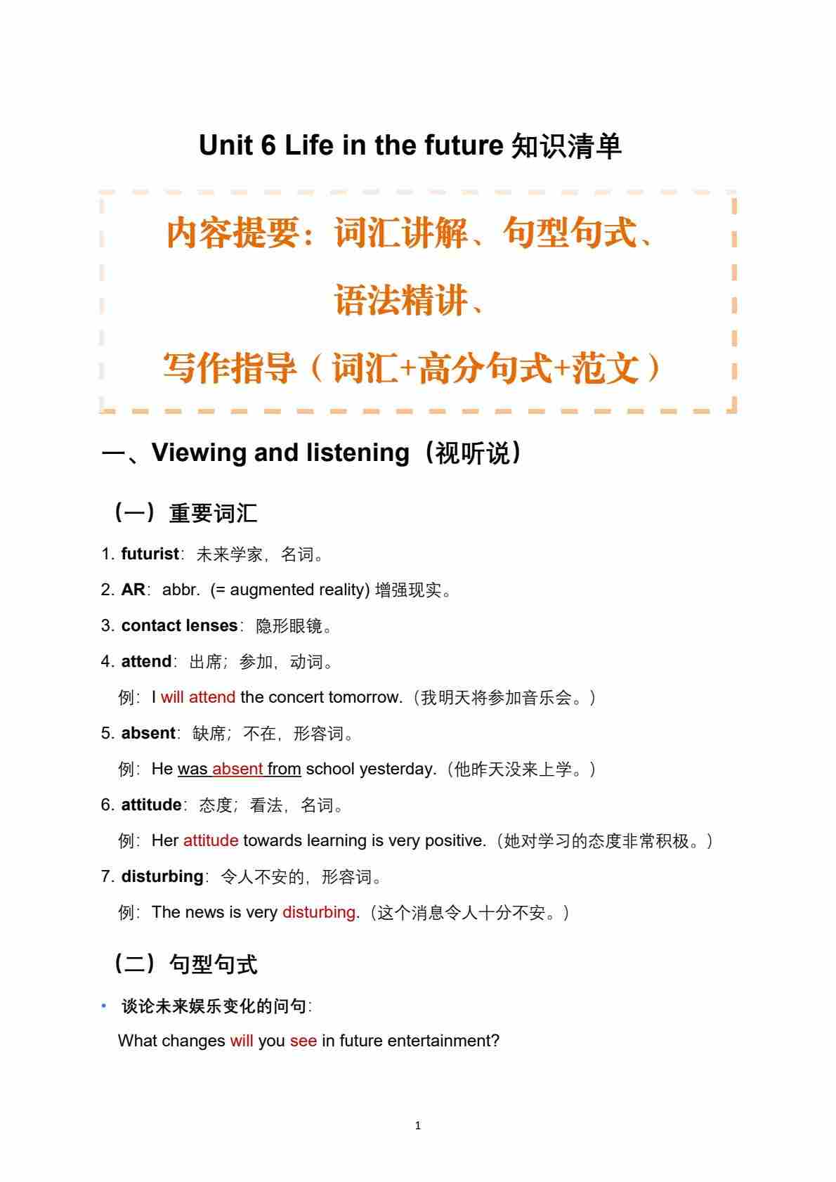 Unit 6 Life in the future 知识清单(详细版)(含写作指导))【沪教版(五四学制)(2024)八上英语】