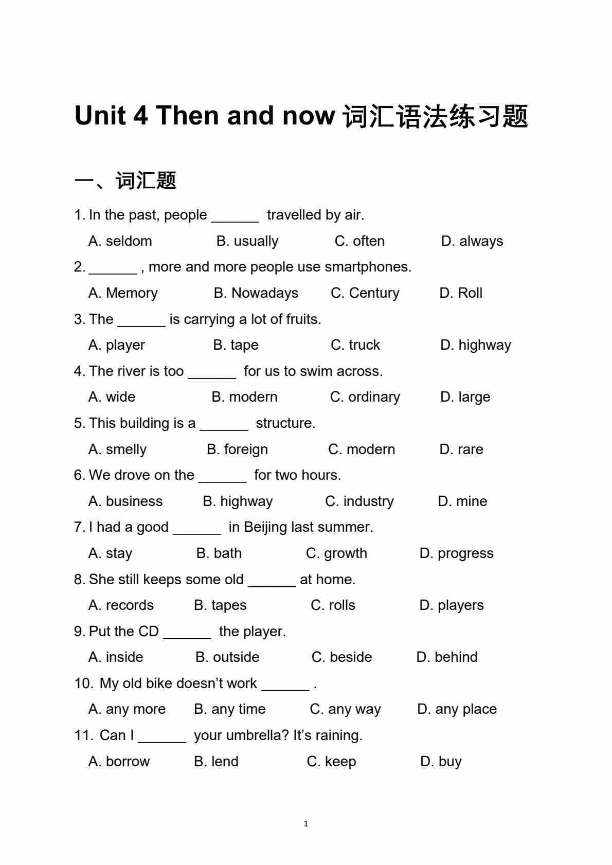 沪教54版---Unit 4 Then and now词汇语法练习题(含答案解析)【沪教版(五四学制)(2024)八上英语】